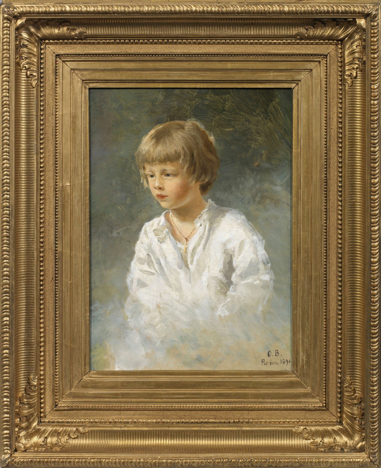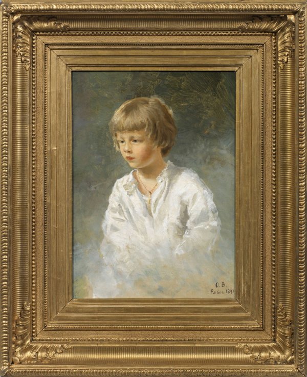 Feinfühlig charakterisierendes, realistisches, in duftig hellem, zartem Kolorit und mit weichem Schmelz gemaltes Kinderbildnis. Olga Bariatinsky, die vor allem als gefragte Porträtmalerin in Rom tätig war, stammte aus einer bedeutenden russischen Fürstenfamilie - sie war die Tochter von Fürst Viktor Ivanovich Bariatinsky (1823 - 1904), einem Freund von Ivan Aivazovsky. 1893 nahm sie mit dem Gemälde "Portrait of Prince Bariatinsky" (höchstwahrscheinlich ein Porträt ihres Vaters) an der Weltausstellung in Chicago teil; im Frühjahr 1917 beschickte sie die "Ausstellung russischer Künstler und Kunstliebhaber in Rom". Werke der Malerin befinden sich u. a. im Palazzo Braschi im Museum der Stadt Rom (Bildnis des Sammlers Graf G. S. Stroganov, 1902). Öl/Lwd.; R. u. monogr. u. dat. 1896 mit Ortsangabe "Rome". Überdies verso auf dem Keilrahmen kyrillische Inschrift mit Angaben zum Modell, dat. 1896. 38 cm x 28,5 cm. Rahmen.