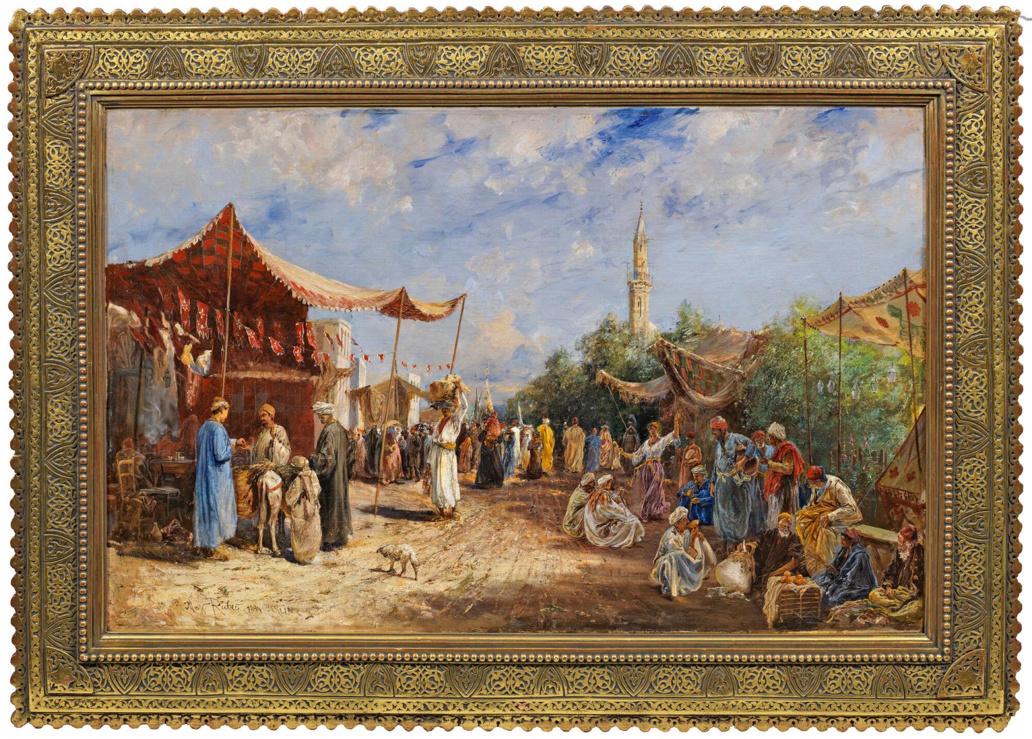 Das prachtvolle, in leuchtenden Farben im impressionistischen Malduktus mit breitem, schnell geführten Pinsel gemalte Orientbild zeigt einen belebten Straßenzug mit Marktständen in Kairo. Auf dem Minarett im Hintergrund ruft der Muezzin im blauen Gewand. An beiden Seiten des unbefestigten Weges sind Zelte zum Schutz gegen die brennende Sonne aufgebaut, unter denen Händler ihre Waren anbieten, mit aufspielenden Musikern und tanzender Orientalin sowie andere, das von einem Käufer mit Krug angebotene Wasser trinkend. Rechts unten im Bild zwischen vier älteren Männern sitzend, eine anmutige Araberin mit Schmuck und blauem Gewand, die ein Dutzend Orangen feilbietet. Auf der gegenüberliegenden Seite ein mit Waren bepackter Esel vor einem Café mit Tischen und Stühlen. Das Gemälde entstand nach einer längeren Ägyptenreise, die bei Rabes eine Begeisterung für Orientmotive auslöste und ihn bald zu einem der gefragtesten deutschen Orientmaler aufsteigen ließ. Nach der Wiederentdeckung der Pyramiden beim Napoleonfeldzug, der Eröffnung des Suezkanals 1869 und dem Eisenbahnbau, wurde Ägypten nicht nur wirtschaftlich interessant, sondern auch zum touristischen Sehnsuchtsort vieler Europäer. Auf den internationalen Weltausstellungen nach 1870 in Wien und Paris wurden exotische Waren in spektakulären ägyptischen Tempelbauten einem Millionenpublikum dargeboten. Die Orientfaszination wirkte sich schnell auf alle Bereiche von Kunst, Architektur, Literatur und Musik aus. Der Orient wurde zu einer märchenhaften Gegenwelt verklärt wie im Buch "1001 Nacht". Auch auf den internationalen Kunstausstellungen wurden Dutzende Orientmotive mit Pyramiden, in den Wüstenoasen lebenden Arabern und besonders häufig, quirlig belebte Straßenszenen aus Kairo präsentiert. Die scheinbare Sorglosigkeit des alltäglichen Lebens der Nordafrikaner empfand man als krassen Gegensatz zu den realen Lebensverhältnissen der Europäer. Das wandfüllende Gemälde schuf Rabes in seinem Berliner Atelier vermutlich im Auftrag eines Sammlers. Ein recht ähnliches Bild mit dem Titel "Arabischer Handel" wurde 1895 in der Großen Berliner Kunstausstellung präsentiert und vom Museum in Schwerin erworben (Kriegsverlust). Öl/Lwd. L. u. sign. u. dat. "Max Rabes 1894 Berlin". 78 cm x 123 cm. Original-Rahmen.