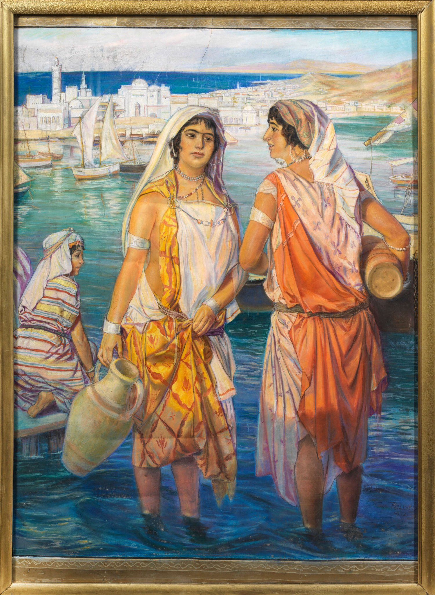 Imposantes, in leuchtendem Kolorit strahlendes, dekoratives Werk mit lebensgroß geschilderten Figuren, das den exotischen Reiz des Orients und das mediterrane Licht zum Ausdruck bringt. Reusch schilderte mit Vorliebe orientalische Akte, Haremsszenen und Schönheiten, teilw. mit nordafrikanischen Bezügen. Pastell/Papier. R. u. sign. u. dar. 1932. Läsuren. Ca. 170 cm x 128 cm. Rahmen.