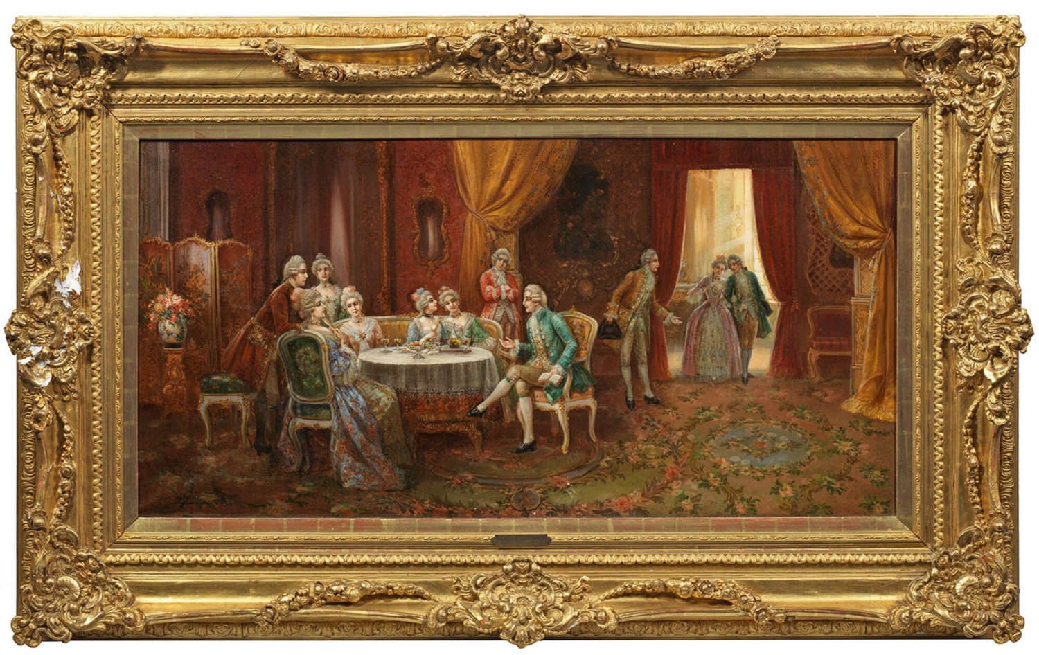 Blick in einen Schloss-Salon mit versammelter höfischer Rokoko-Gesellschaft, in der Bildmitte ein junger Herr bei der Rezitation aus einem Buch. Großformatiges, historisierendes, motiv-und stiltypisches Genrebild Sedlaceks, der mit Vorliebe elegante Rokoko-Motive in prunkvollen Interieurs aus der Epoche von Maria Theresia schilderte. Hierbei galt sein künstlerisches Interesse insbesondere der Wiedergabe des Stofflichen, der prachtvollen Kleider und der repräsentativen Räume mit ihrer Ausstattung. Öl/Lwd.; L. u. sign.; Verso und auf Rahmenplakette betitelt. 70 cm x 140 cm. Prunkrahmen.