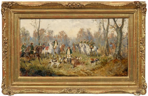 Vielfigurige Szene aus der Barock-Zeit auf einer Lichtung. Motiv- und stiltypisches Werk des Wiener Künstlers, der sich auf lebendig geschilderte Reiter- und Pferdemotive, Schlachtendarstellungen und Szenen aus dem ungarischen Volksleben etc. spezialisierte. Zu Bensas Auftraggebern und Sammlern zählten die Mitglieder des Wiener Kaiserhauses, Adelige wie Herzog August von Sachsen-Coburg und Gotha und das gehobene Bürgertum. Wiederholt beschickte er die Ausstellungen des Österreichischen Kunstvereins und des Wiener Künstlerhauses. Öl/Holztafel. R. u. sign.; 21 cm x 37 cm. Rahmen.