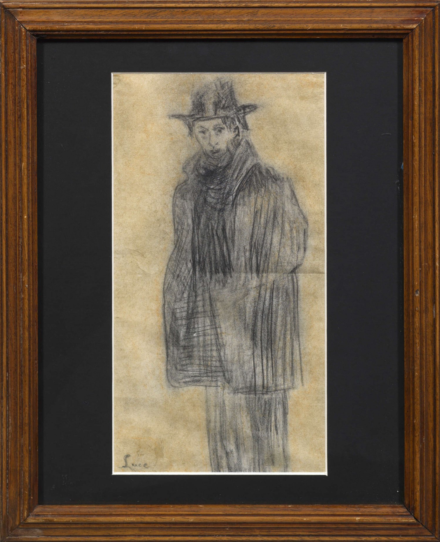 Luce fertigte mehrere Porträts Fénéons, der sich stark für die Avantgarde-Kunst engagierte und als Schöpfer des Stilbegriffs Neoimpressionismus gilt, eine Richtung, die auch Pointillismus genannt wird und der Luce zeitweise folgte. Schwarze Kreide/chamoisfarbenes Papier. L. u. sign.; Passepartoutausschnitt 31 cm x 16,4 cm. Rahmen.