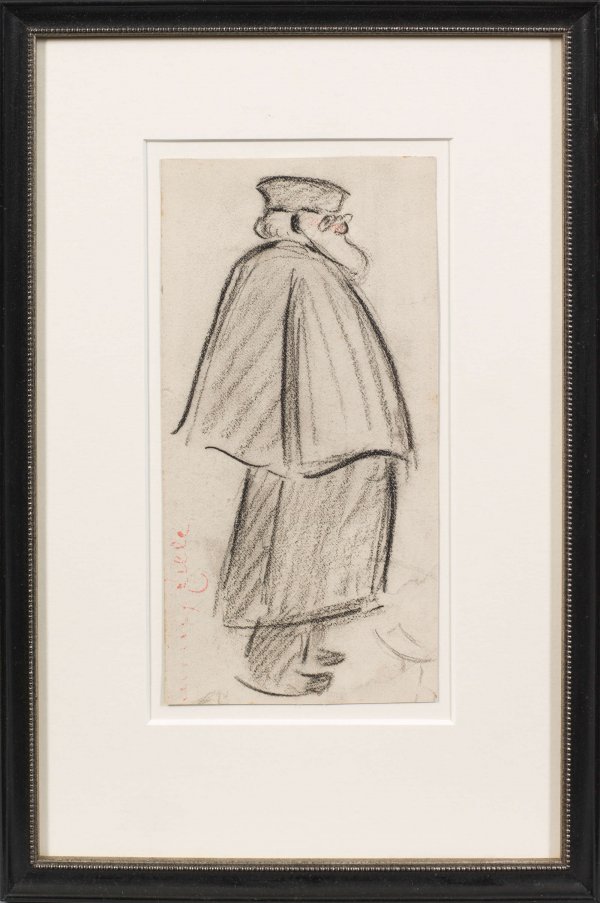 Die reizvolle Zeichnung spiegelt die große Meisterschaft wider, mit der Zille durch wenige, sichere, geschwungene Umrisslinien zunächst die Figur konturierte, um ihr danach mittels Schraffuren eine größere plastische Tiefe zu verleihen. Dargestellt ist ein älterer, vollbärtiger Herr mit Kneifer und Barett, womit Zille einen Richter karikiert haben dürfte. Zille war ein scharfer Beobachter des Berliner Alltagslebens, das ihn nicht nur in sein unmittelbares "Milljöh", sondern auch öfters in das Kriminalgericht Moabit führte. Kohle/Velin. L. u. Nachlass-Stempel in Rot (Lugt 2676b, Rosenbach 1). 20 cm x 13 cm (Passepartoutausschnitt). Rahmen.