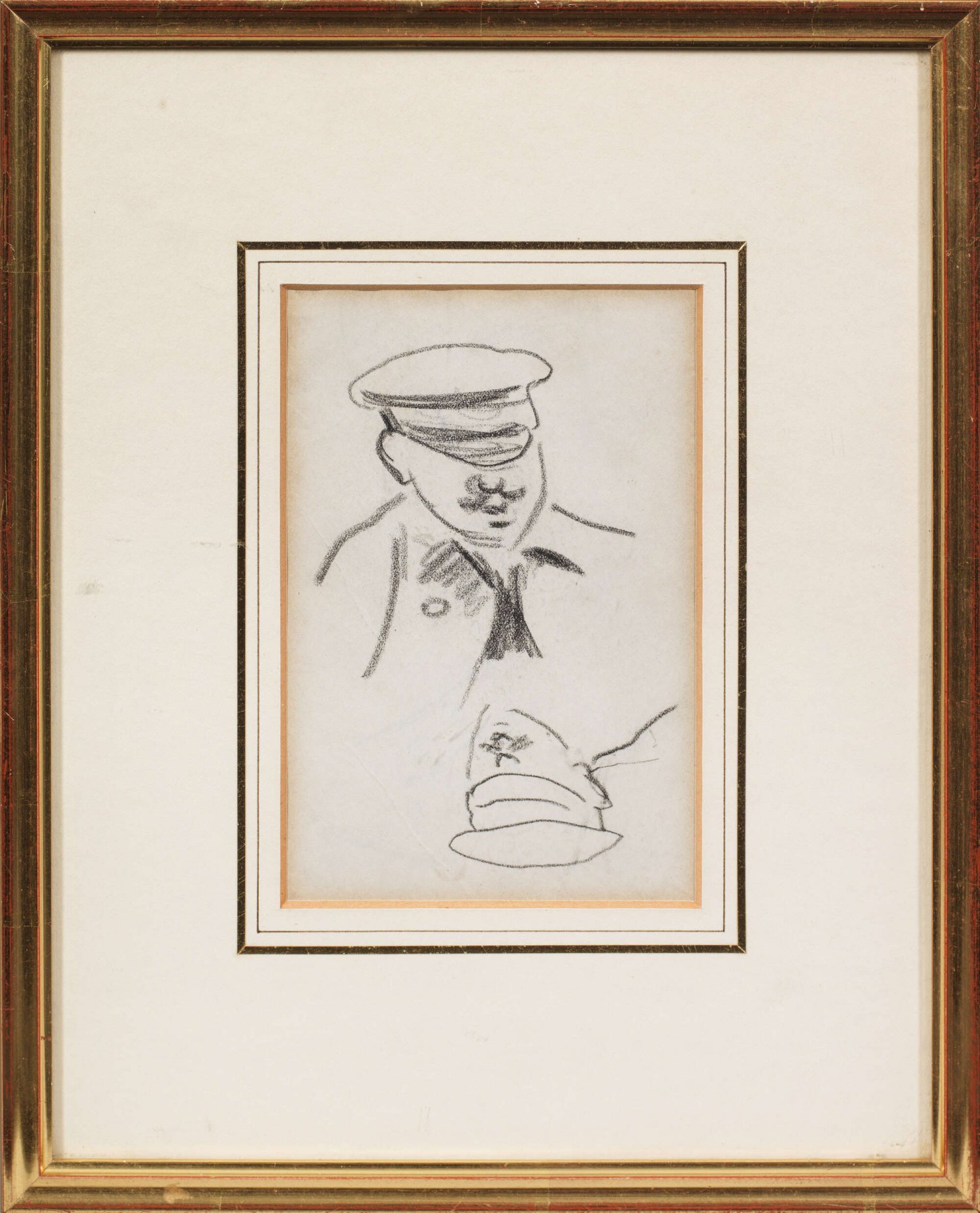 Mit wenigen, meisterhaft sicheren Strichen gelingt es Zille in der reizvollen Zeichnung den Mann zu karikieren, bei dem es sich aufgrund der Studentenmütze wohl um einen wilhelminischen "Alten Herrn" aus einer Studentenverbindung handeln dürfte. Schwarze Kreide/Papier. Verso Nachlass-Stempel in Rot (Lugt 2676b, Rosenbach 1). 16,5 cm x 11,5 cm. Rahmen.
