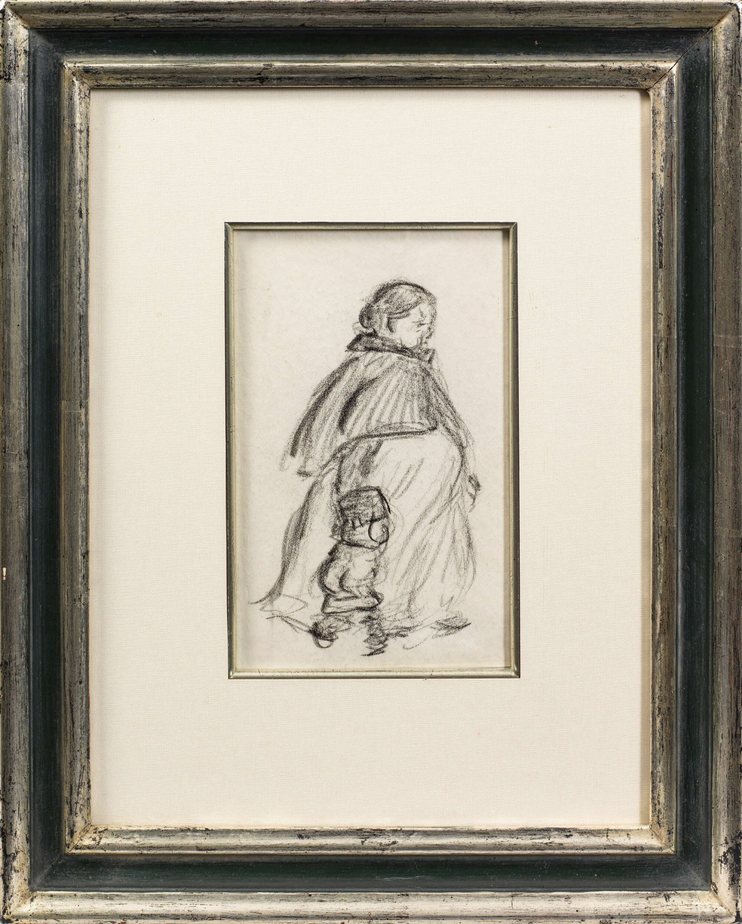 Die sicher gesetzten Striche zeigen ein für Zille typisches Motiv einer beleibten Mutter, durch die das neben ihr gehende Kind noch viel kleiner wirkt. Eine besondere persönliche Empathie hegte Zille, der besonders durch Schilderungen des Berliner Alltagslebens (seinem "Milljöh") bekannt wurde, stets für Mütter und Kinder, die er authentisch und ungeschönt lebendig in ihrem Alltag darstellte. Kohle/Papier. Verso Stempel "Nachlass Prof. Heinrich Zille" in Rot. 20 cm x 13 cm (Passepartoutausschnitt). Rahmen.