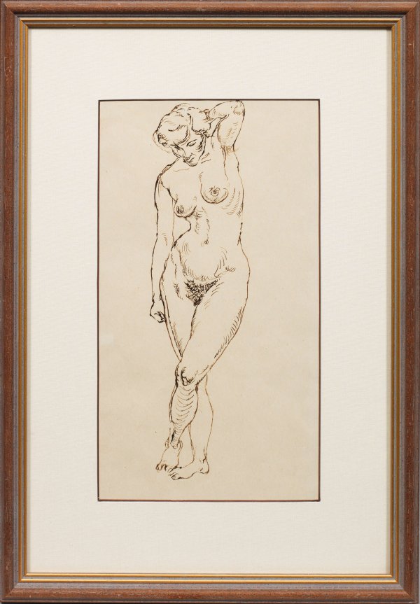 Das 1912 entstandene Blatt gehört zu den frühesten Blättern Grosz', der im selben Jahr sein Studium an der fortschrittlichen Kunstgewerbeschule in Berlin bei dem modern orientierten Künstler Emil Orlik begonnen hatte. Während seines achtmonatigen Studienaufenthaltes 1913 in Paris nahm Grosz weiteren Aktzeichen-Unterricht im Atelier Colarossi. Feder/Papier. Verso Nachlass-Stempel mit Nr. 2/5/9. Blatt 33 cm x 21 cm. Rahmen.