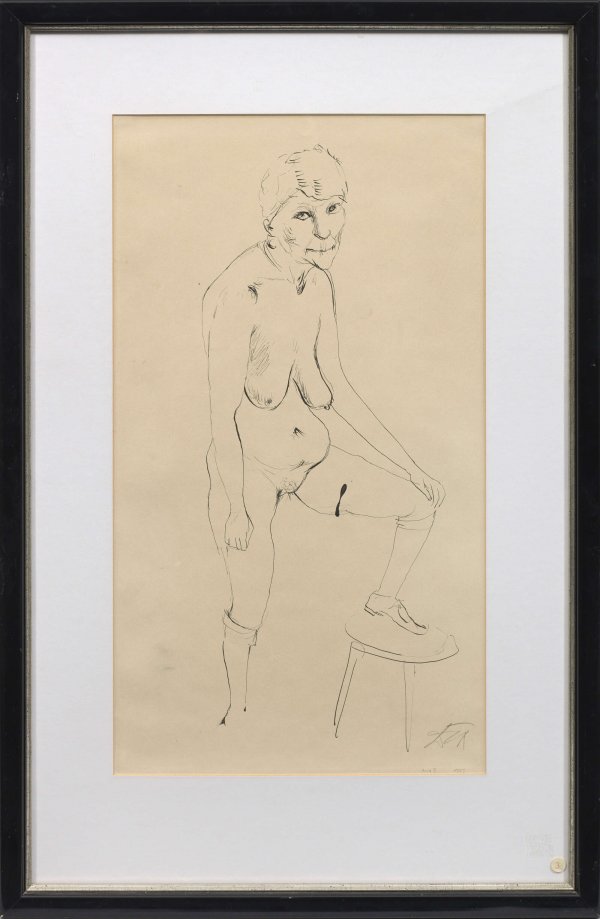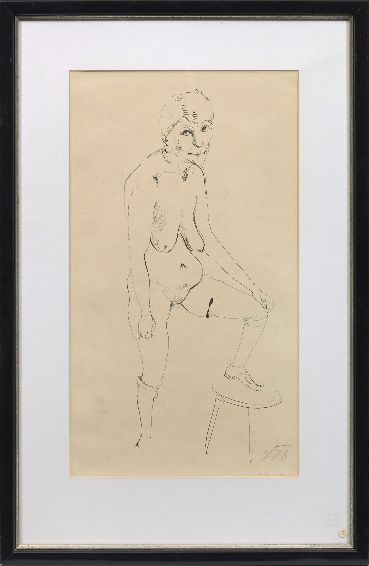 Mit sicherem Strich ausgeführte Aktdarstellung einer älteren, nur mit Schuhen und Kniestrümpfen bekleideten, diagonal im Raum posierenden Frau, die ihren linken Fuß auf einen Hocker gestellt hat; fast en face blickt diese den Betrachter unmittelbar an. Das Blatt ist exemplarisch für den Stil von Otto Dix Anfang der 1920er Jahre und zugleich für dessen tiefe Obsession für die menschliche Existenz und weibliche Akte. Dix, der im Entstehungsjahr dieses Blattes 1922 nach Düsseldorf ging und 1925 nach Berlin, liebte die Großstadt, die Typen und Randgruppen, die er vor allem während der Nacht auf den Straßen und in den Lokalen traf - Prostituierte und ihre Kunden, Matrosen oder Artisten ebenso wie Kriegsversehrte, Kriegsgewinner, Tänzerinnen, tätowierte Frauen etc.; Mit scharfem, veristischem Blick und teilweise grotesker Übersteigerung schilderte er weibliche Akte in jedweder Form: egal, ob jung, alt, dürr oder mit üppigen, sinnlich-erotischen Formen. Auch in dieser Zeichnung der Neuen Sachlichkeit zeigt er den Akt mit schonungsloser, offensiver Direktheit, alles Beschönigende oder Ästhetisierende war dem Künstler fremd. Tuschfeder/Papier. 54 cm x 31 cm. R. u. sign.; überdies betitelt "Anna II" u. dat. 1923. Rahmen.