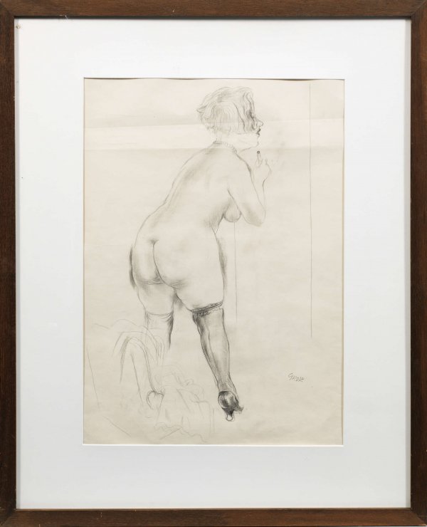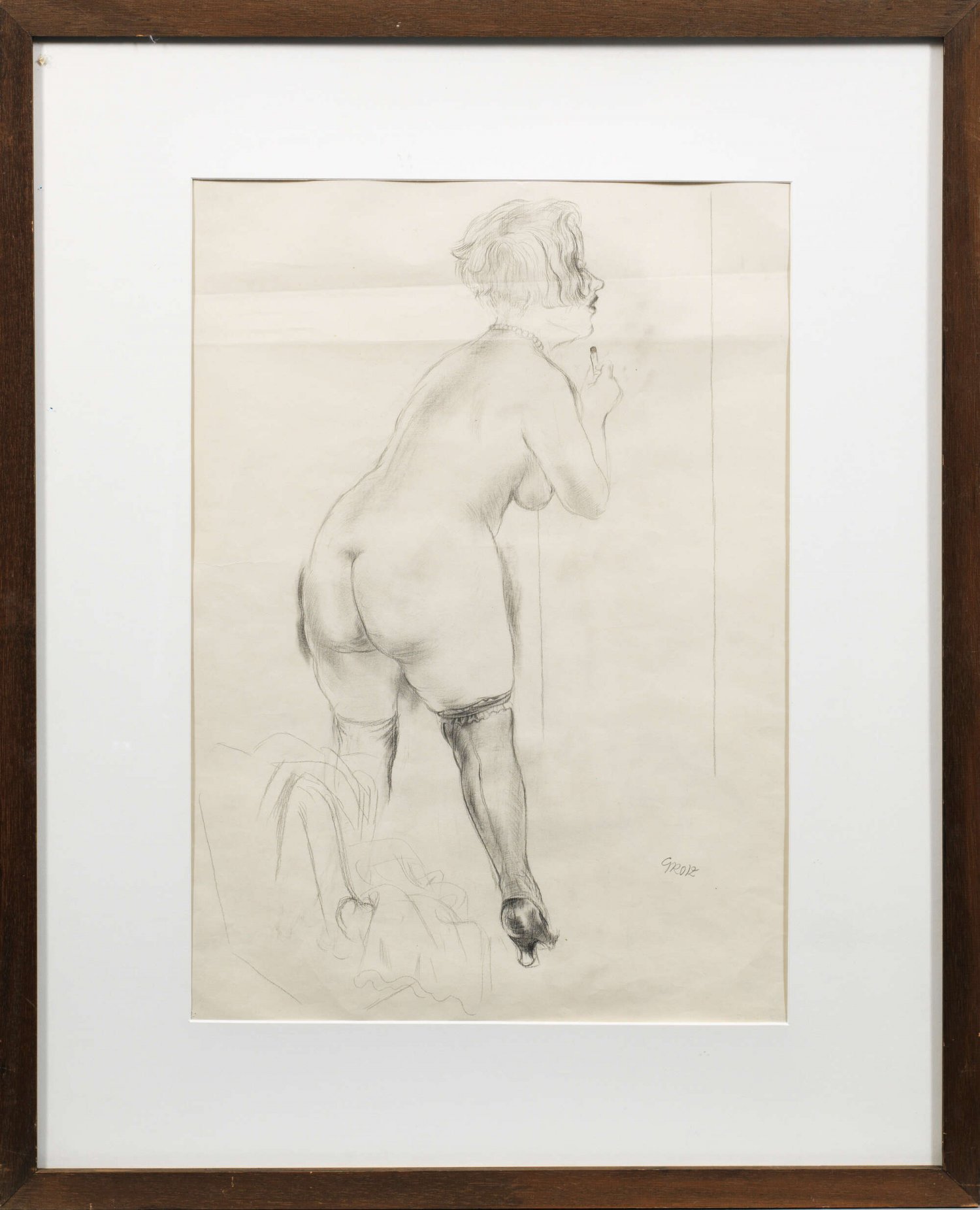 Ganzfigurige Darstellung eines stehenden weiblichen Aktes, der sich in leicht vorgebeugter Pose vor einem Spiegel mit einem Lippenstift schminkt. Grosz, der neben Otto Dix mit seinen kritischen Darstellungen des Berliner Großstadt- und Nachtlebens der bedeutendste Vertreter der Neuen Sachlichkeit in der Weimarer Republik war, zeigt in diesem 1929/31 entstandenen Blatt seine eigene Vorliebe für sinnlich-erotische weibliche Akte. Noch vor der sog. "Machtergreifung" Ende Januar 1933 emigrierte Grosz in die USA. Er gehörte zu den von den Nationalsozialisten am meisten gehassten Persönlichkeiten, seine in Deutschland verbliebenen Werke galten als "entartete Kunst", wurden oft vernichtet oder billigst ins Ausland verkauft. Bleistift u. Kohle/Papier. R. u. sign.; Verso die zweite Bleistift-Zeichnung "Sich bückender weiblicher Akt" von 1929, George-Grosz-Nachlassstempel mit Nr. "5-58-7". Oberhalb ger. knickfaltig. Auf dem Rückenkarton Etikett der Galerie Brockstedt, Hamburg. Blatt 59,9 x 46,0 cm. Rahmen.