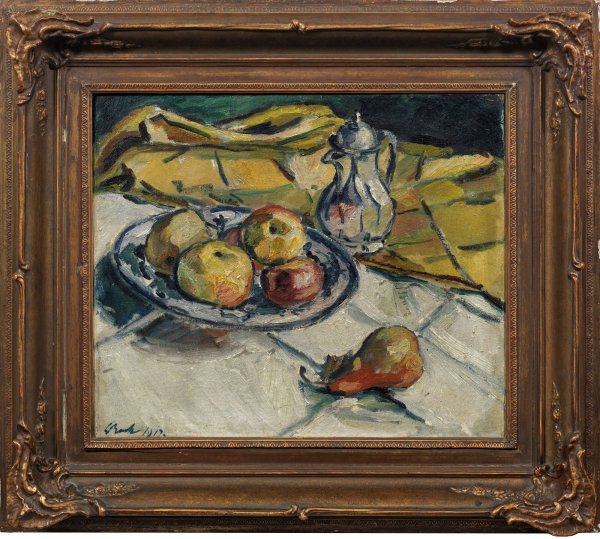 Mit schnellem, weich-pastosem Duktus gemaltes, spätimpressionistisches Stillleben. Bock studierte ab 1906 an der Kunstakademie, u. a. als Meisterschüler Heinrich von Zügels. 1908 beteiligte er sich erstmals an einer Ausstellung der Secession und wurde 1917 deren Mitglied. Von prägendem Einfluss war 1913 eine Paris-Reise, wo er die französische Moderne, Werke von Henri Matisse und Paul Cézanne kennenlernte. Ab 1918 beschickte Bock regelmäßig Ausstellungen, besonders im Glaspalast. 1929 erhielt er den Rom-Preis und das hiermit verbundene Villa Massimo-Stipendium. Öl/Lwd.; L. u. sign. u.dat. 1917. 46 cm x 54 cm Rahmen.