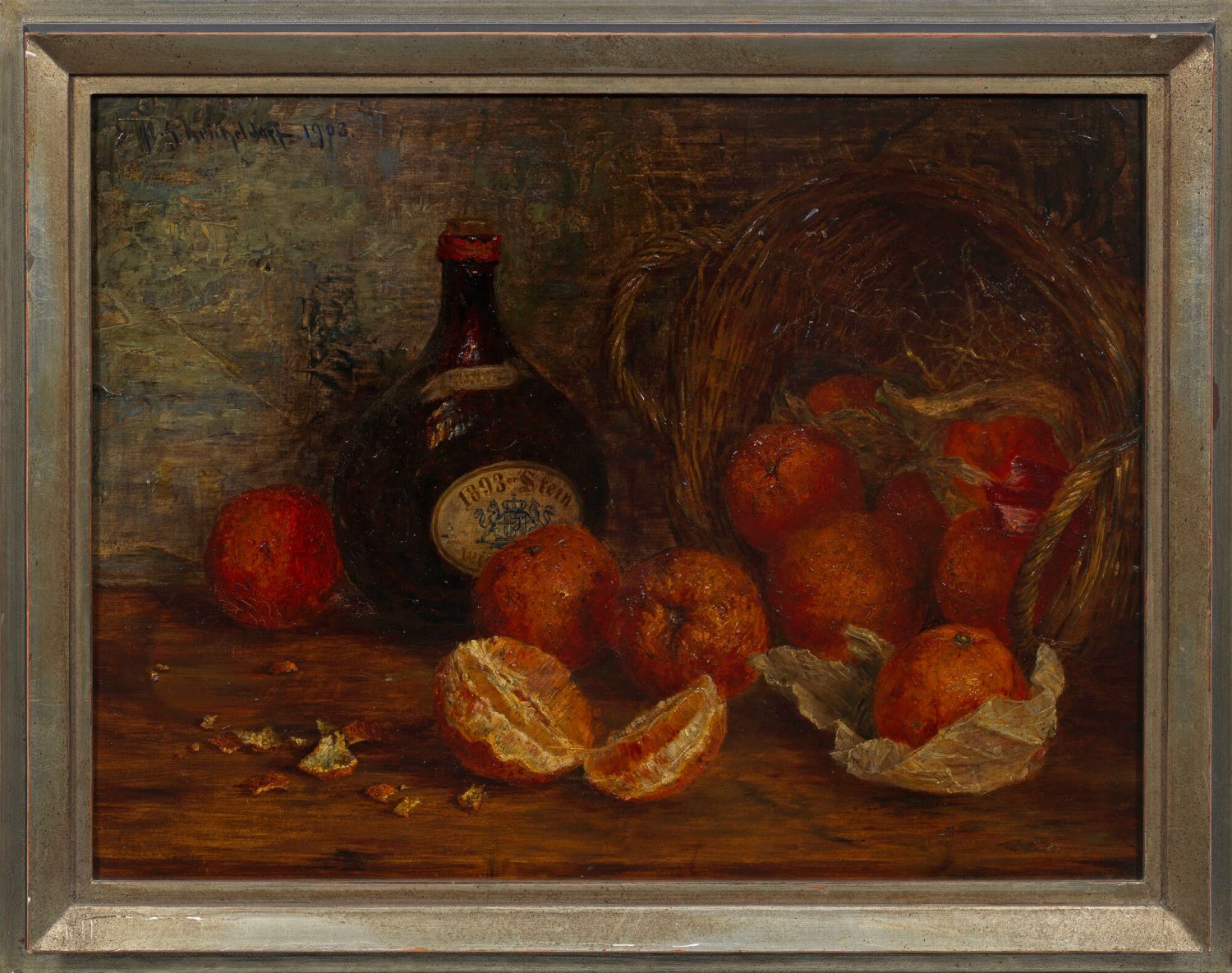Stillleben mit Orangen und Würzburger Bocksbeutelflasche