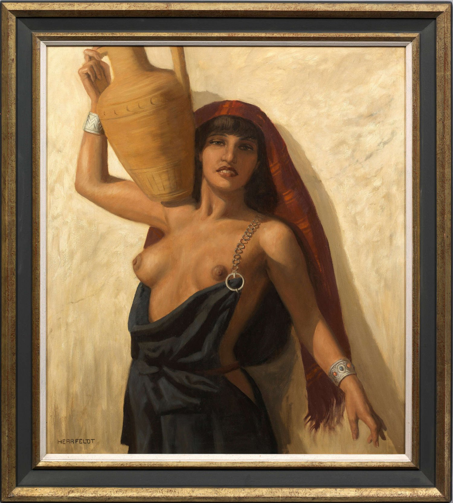 Halbakt einer jungen, südländischen Frau mit Amphore auf der Schulter. In Motiv und Stil typisches, für Herrfeldts Oeuvre repräsentatives Werk. Der Maler studierte in München, Florenz und Paris u. a. bei Franz von Stuck. Als Mitglied der Münchener Künstler-Genossenschaft stellte Herrfeldt 1921 erstmals aus und fand mit seinem Gemälde "Sklavin" auf der Ausstellung im Glaspalast größere Beachtung. Herrfeldt spezialisierte sich auf Aktdarstellungen, oft in explizit lasziv-erotischen Posen, wobei er sowohl blonde Schönheiten in Strandszenen als auch verführerische südländische Frauen, Spanierinnen und Orientalinnen darstellte, die den exotisch-mystischen Reiz des "Orients" widerspiegeln. Öl/Lwd.; L. u. sign.; 80 cm x 70 cm. Rahmen.