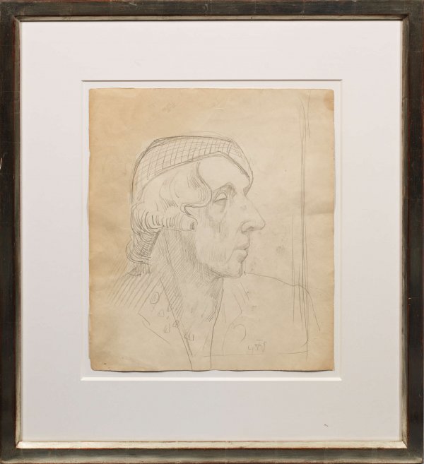 Bei dem mit umreißenden Strichen sowie den Hals und die Augenringe akzentuierenden Schraffuren ausgeführten Brustbildnis aus dem Jahr 1949 ging es Dix um das markante, androgyne, charaktervolle Profil der Dargestellten. In seiner Kantigkeit mit ihrer großen Nase faszinierte es und forderte es ihn als Künstler heraus. Eine gewisse Weichheit lässt Dix lediglich in den ondulierten Locken und dem zur Seite geschobenen Hütchen zu. Seinem gleichsam sezierenden sog. "bösen Blick" entging Dix niemand, nicht einmal er selbst, wenn er sich voller Ingrimm oft ebenfalls im Profil darstellte. Dix, der bedeutende Expressionst, Verist und Künstler der Neuen Sachlickeit in der Weimarer Republik, konnte nach 1945 an sein früheres Schaffen anknüpfen, wobei er oft von Hemmenhofen nach Dresden reiste, wo er ein zweites Atelier hatte. Bleistift/Velin. R. u. monogr. u. dat. (19)49. 42,4 cm x 36,7 cm. Atelier- bzw. Lagerspuren. Rahmen.