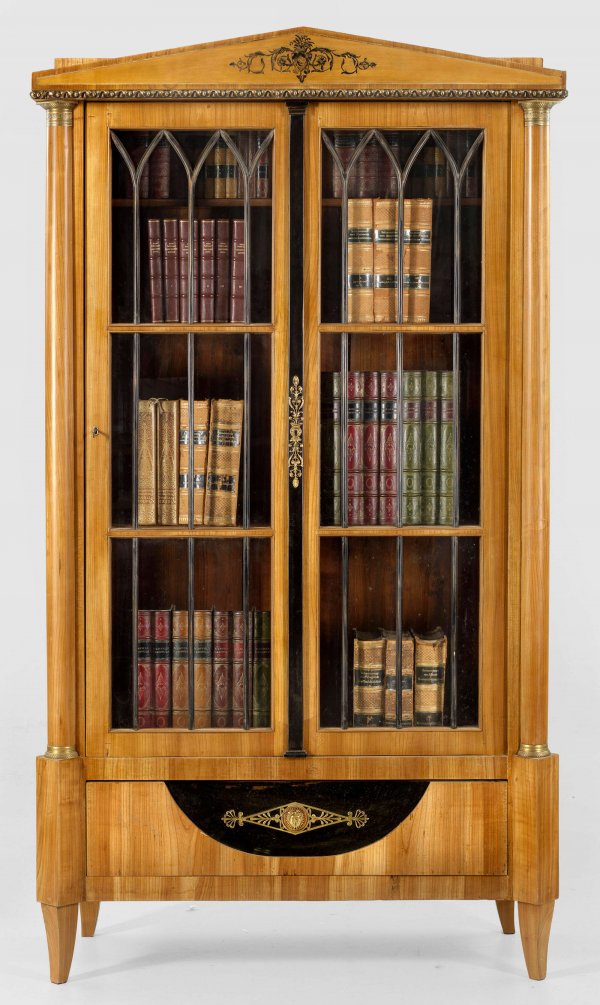 Biedermeier-Bücherschrank Kirschbaum, furniert sowie teilw. ebonisiert. Gerader, hochrechteckiger Korpus, flankiert von eingestellten Dreiviertelsäulen auf konischen Vierkantbeinen. In der gegliederten Front großes Schubfach mit umgekehrtem Segmentbogen sowie sprossenverglaste, optisch zweigeteilte Vitrinentür. Oberhalb flaches Giebelfeld mit Dekorationen aus Blattvoluten. H. 190 cm. 105 cm x 42 cm.