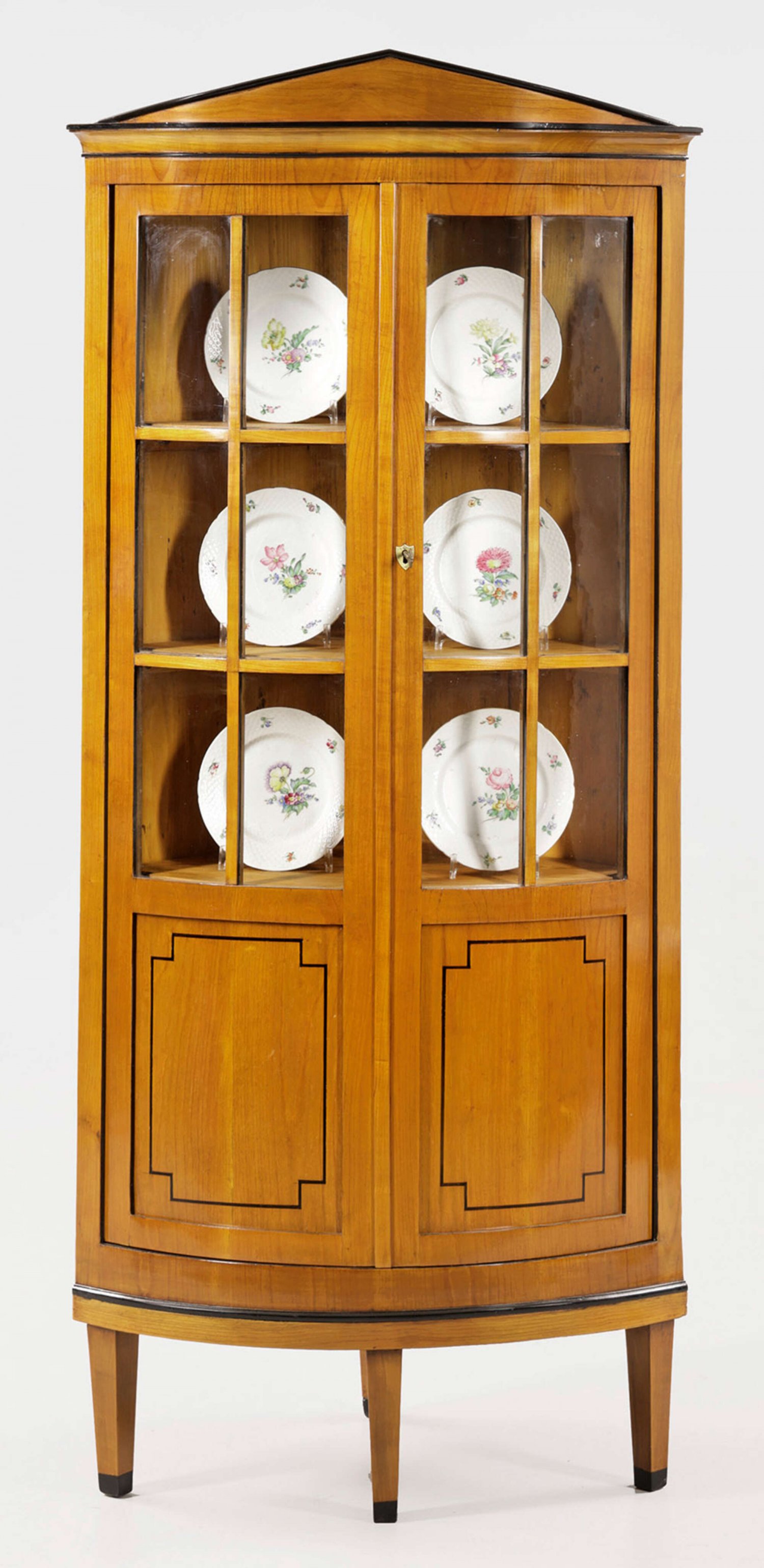Biedermeier-Eckvitrinenschrank Kirschbaum, furniert und teilw. ebonisiert. Bombierter Korpus auf konischen Vierkantbeinen. In der gegliederten Front zwei sprossenverglaste Vitrinentüren. Schmales Kranzgesims sowie flacher Schinkelgiebel als oberer Abschluss. Rest.; H. 187 cm. Schenkel-T. 58,5 cm.