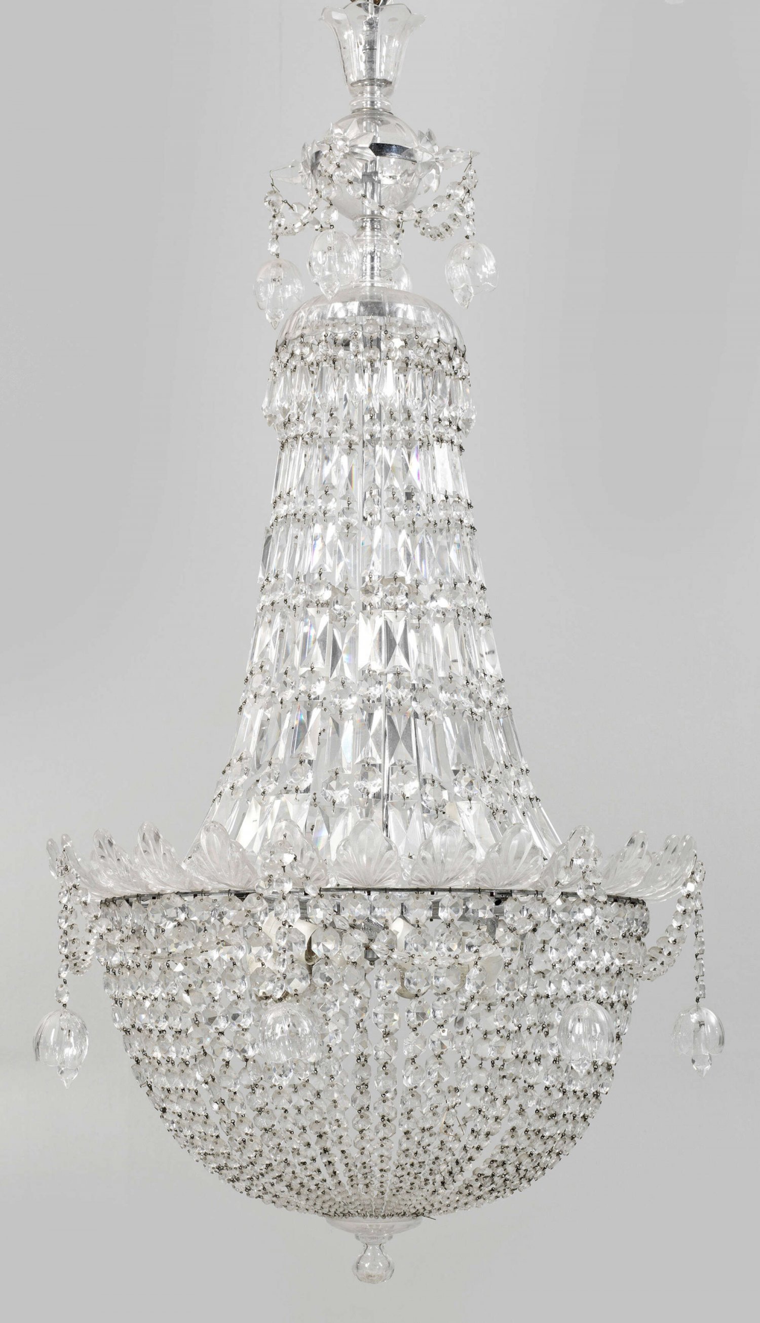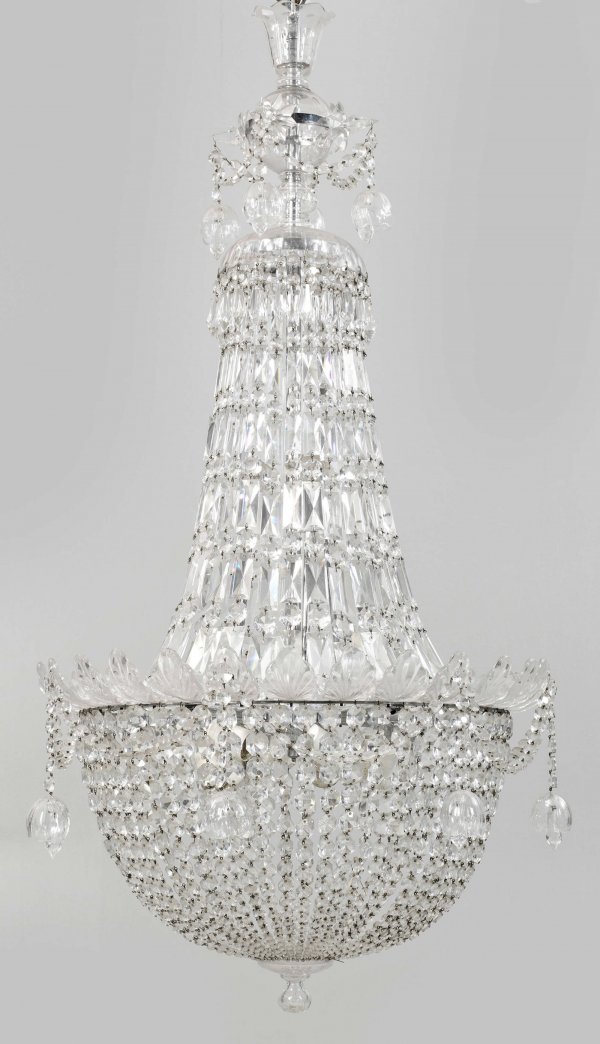 Großer Deckenlüster Farbloses Kristallglas sowie Metall, verchromt. Balusterförmiger Korpus aus dichten Prismenschnüren im Verlauf. Umlaufend reliefierte Blattmotive sowie Prismengirlanden mit blütenförmigen Anhängern. Korrespondierender oberer Abschluss. Innen zwölf Lampenfassungen. Elektrifiziert. H. 130 cm. D. 66 cm.