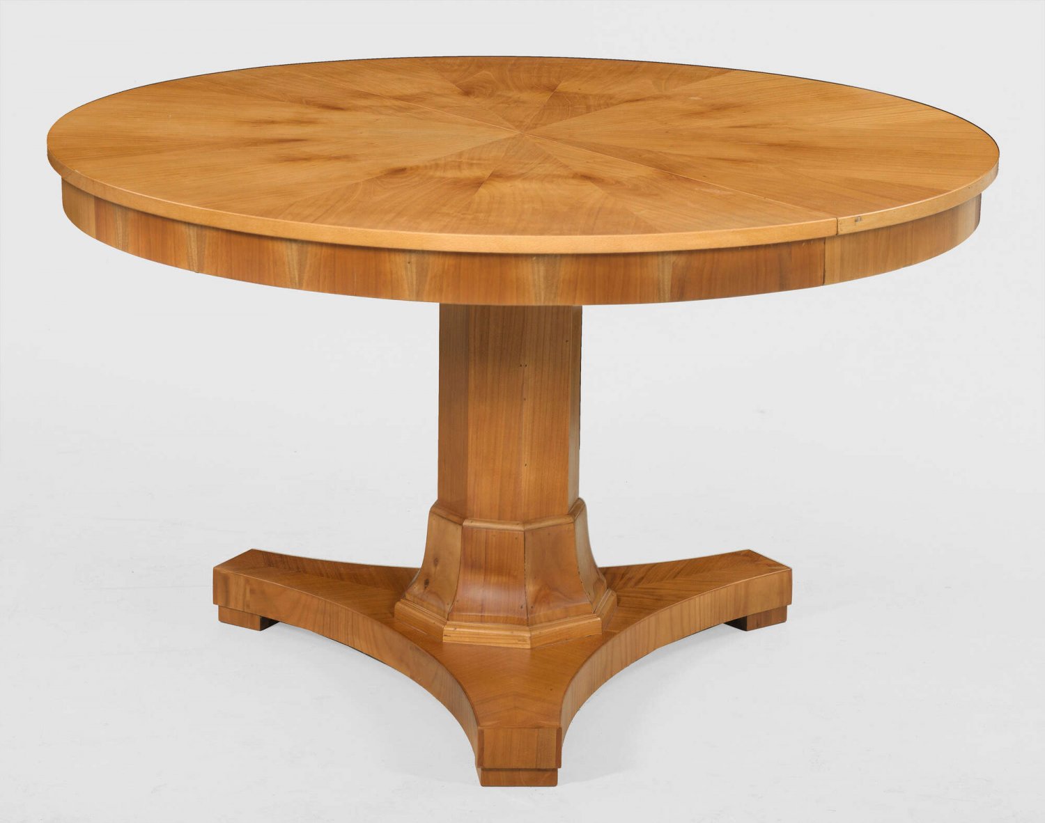 Biedermeier-Salontisch Kirschbaum, furniert. Über dreiseitig konkav eingezogener Sockelplatte und flachen Füßen mehrfach gekanteter Schaft als Träger für bombierte Zarge und runde, ehemals ausziehbare Deckplatte. H. 72 cm. D. 119 cm.