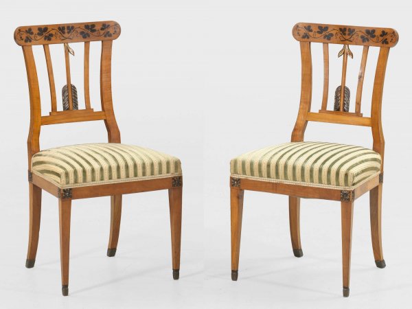 Paar Biedermeier-Stühle Kirschbaum, massiv und furniert. Trapezförmige Zarge auf konischen Vierkantbeinen. Durchbrochen gearbeitete Rückenlehne aus gebogten Streben und Pfeilmotiv sowie gerundetem Abschluss mit Fries aus Weinlaub. Sitzfläche gepolstert und bezogen. Sitz-H. 47 cm.