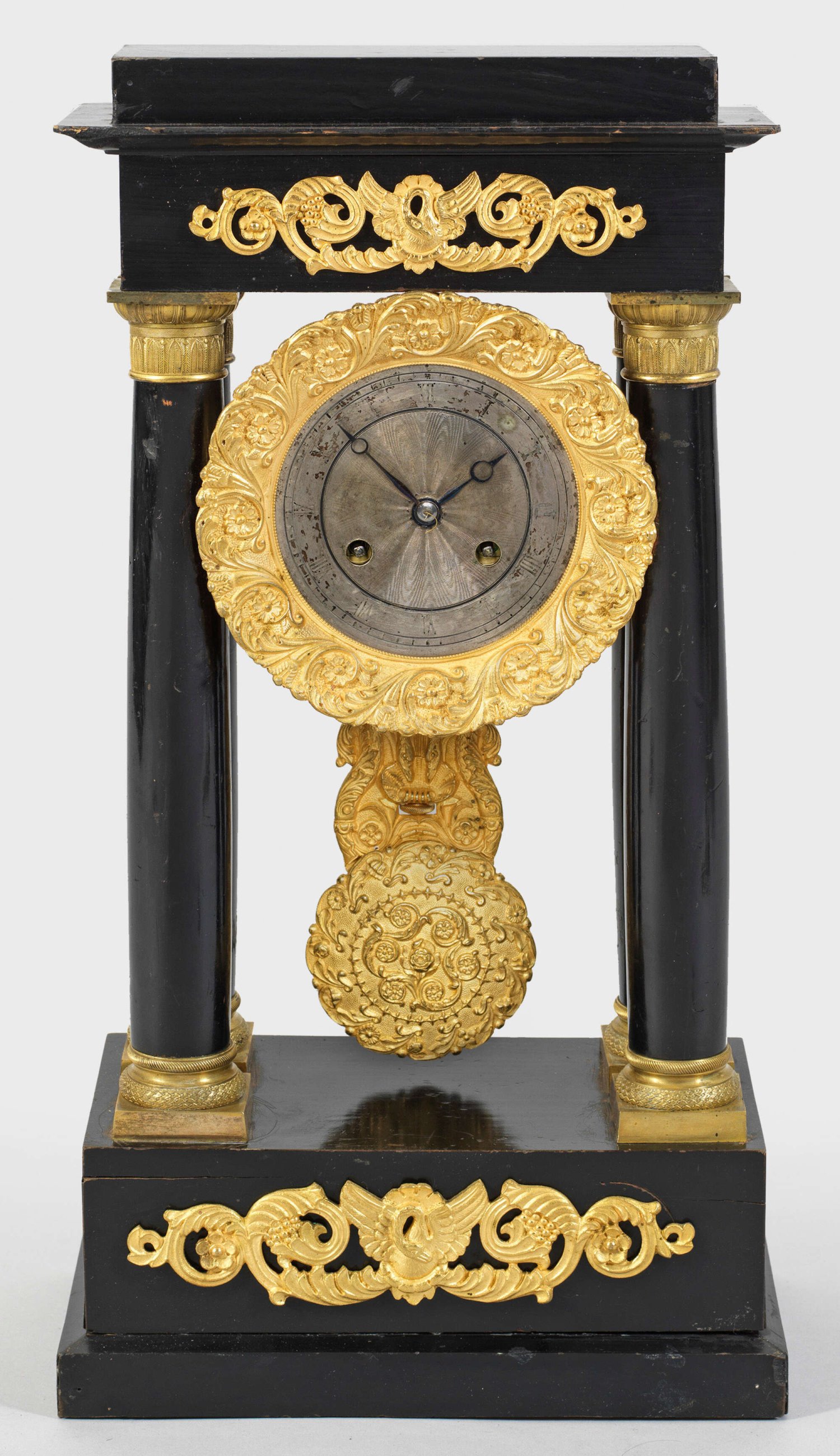 Portaluhr Holz, ebonisiert sowie vergoldete Bronze. Architektonisch gegliedertes Uhrengehäuse aus Vollsäulen. Guillochiertes Zifferblatt mit breiter Rahmung aus Voluten. Pendulenwerk mit Pendelfeder sowie Halbstundenschlag auf Glocke. H. 44,5 cm.