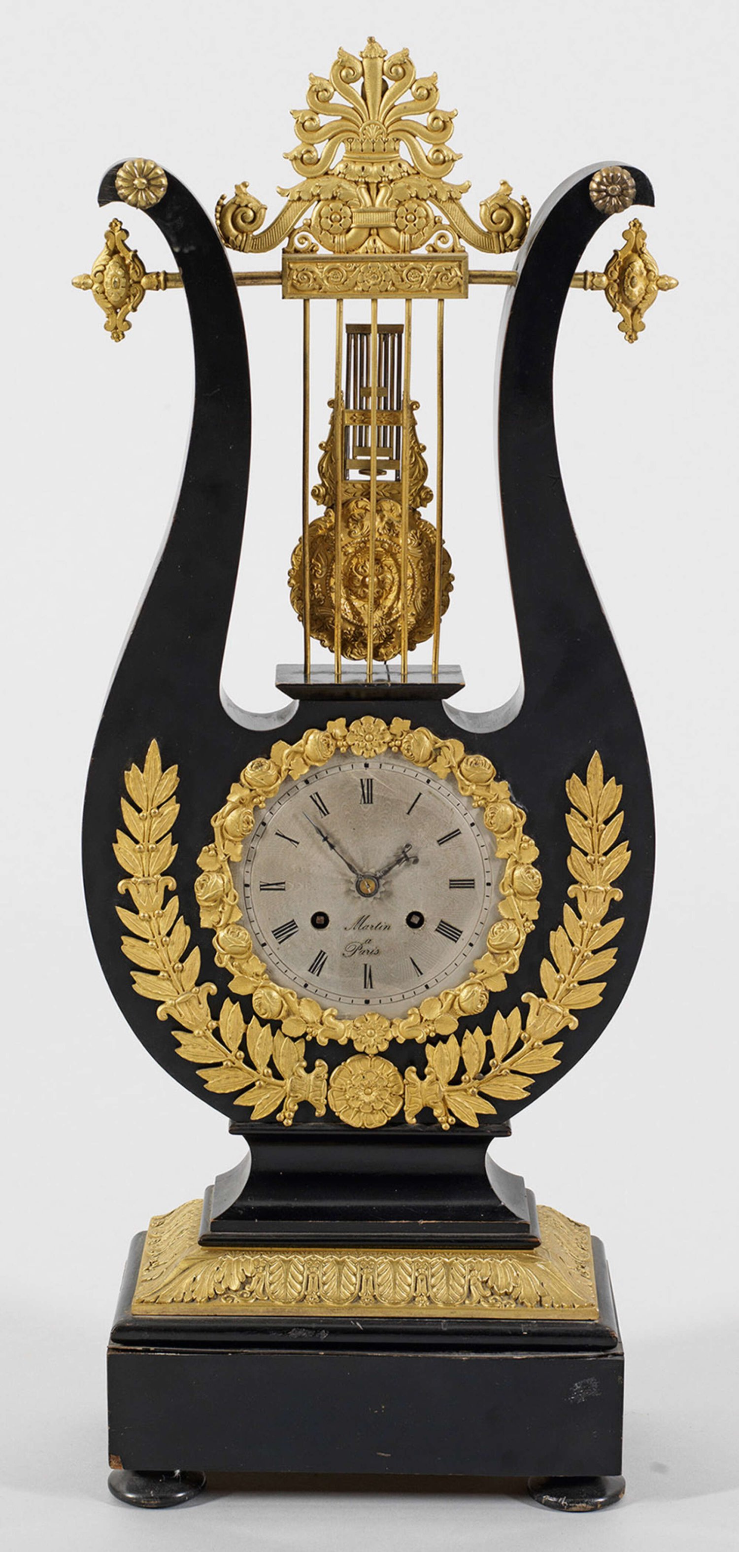 Charles X-Lyrapendule Holz, ebonisiert sowie vergoldete Bronze. Durchbrochen gearbeiteter Korpus in Form einer großen Lyra mit applizierten Lorbeerblättern und Volutenbekrönung auf Profilsockel mit breitem Palmettenfries. Von Rosen gerahmtes, fein guillochiertes Zifferblatt, bez. Martin à Paris. Pendulenwerk mit Pendelfeder sowie Halbstundenschlag auf Glocke. H. 57 cm. 20 cm x 11 cm.