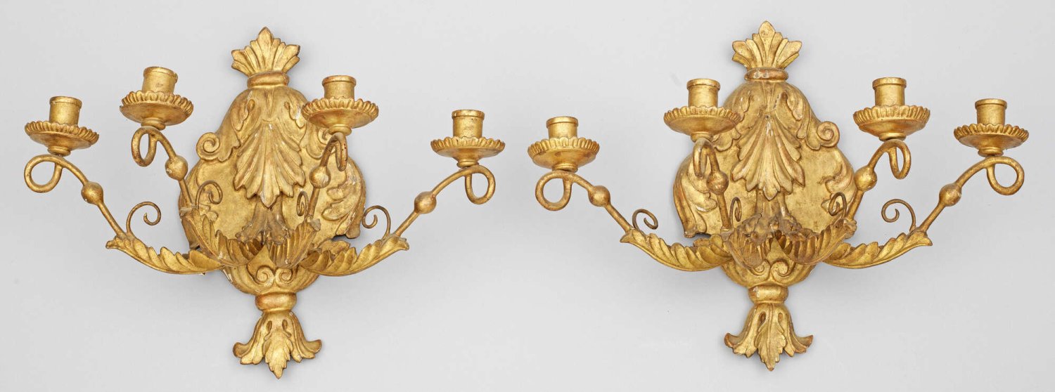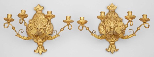 Paar Biedermeier-Wandappliken 4-flg.; Holz geschnitzt, gefasst und vergoldet. Kartuschenförmiges Wandschild mit erhaben reliefiertem Blattwerk. Davon ausgehend stark geschwungene Leuchterarme aus Metall mit vasenförmigen Tüllen. Unw. besch.; H. 39 cm.