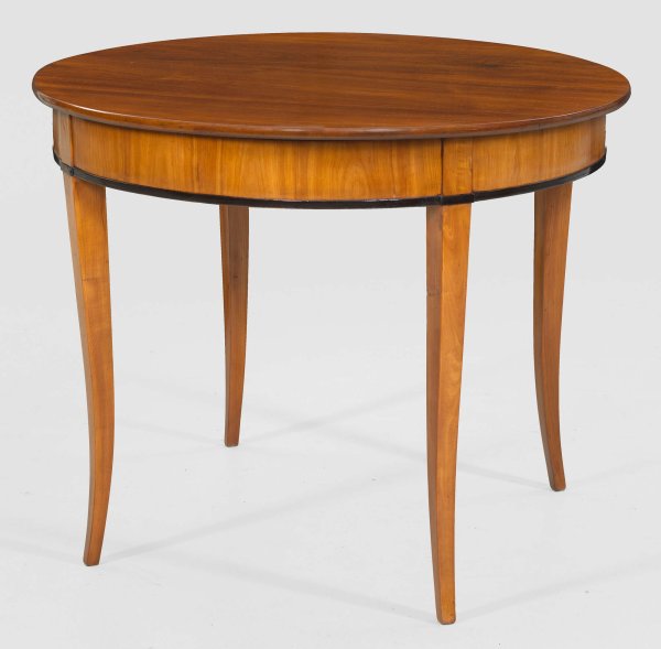 Biedermeier-Salontisch Kirschbaum, furniert und teilw. ebonisiert. Bombierte Zarge auf konischen, leicht ausgestellten Vierkantbeinen als Träger für runde Deckplatte. H. 77 cm. D. 97 cm.