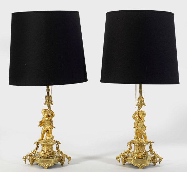 Paar Belle Epoque-Tischlampen 2-flg.; Gegenstücke. Bronze, vergoldet. Über gestuft ansteigendem Podestsockel, flankiert von Blütenfestons vollplastisch gestaltete Puttenknaben mit Füllhorn als Träger für Leuchtmittel. Leicht konischer Lampenschirm. Neuzeitlich als Lampe montiert. H. 68 cm.