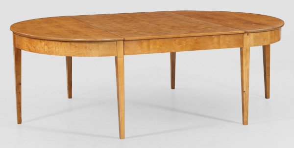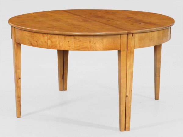 Biedermeier-Ausziehtisch Birkenholz, massiv und furniert. Bombierte Zarge auf konischen Vierkantbeinen als Träger für gering überstehende Deckplatte. Dazu eine erg. Einlegeplatte. H. 77,5 cm. 137 cm x 138/238 cm.
