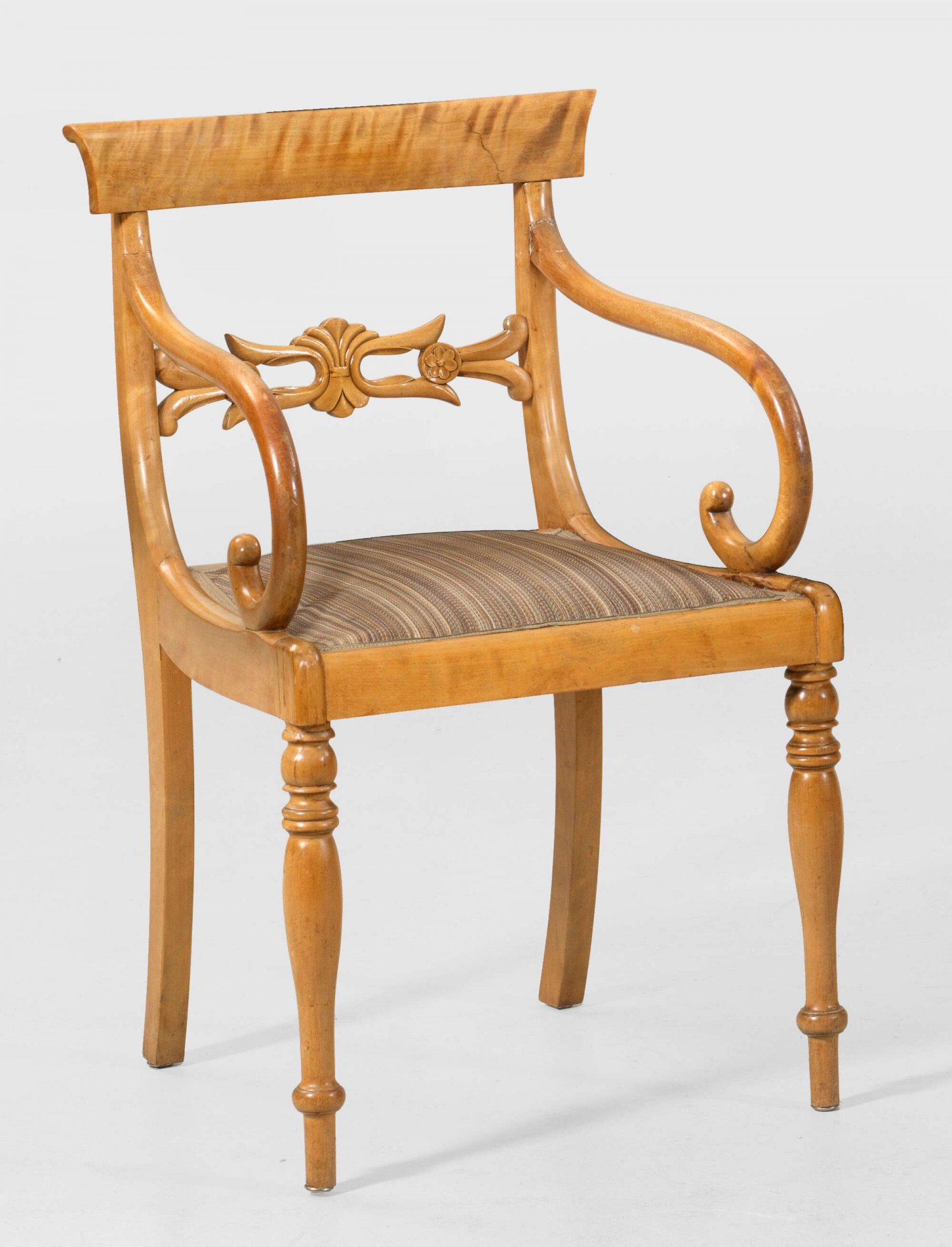 Biedermeier-Armlehnstuhl Birkenholz. Trapezförmige Zarge auf mehrfach gegliederten Balusterbeinen. Stark geschwungene Armlehnen, in offen gestaltete Rückenlehne mit blattreliefiertem Mittelsteg übergehend. Sitzfläche gepolstert und mit braun gestreiftem Rosshaar bezogen. Sitz-H. 47 cm.