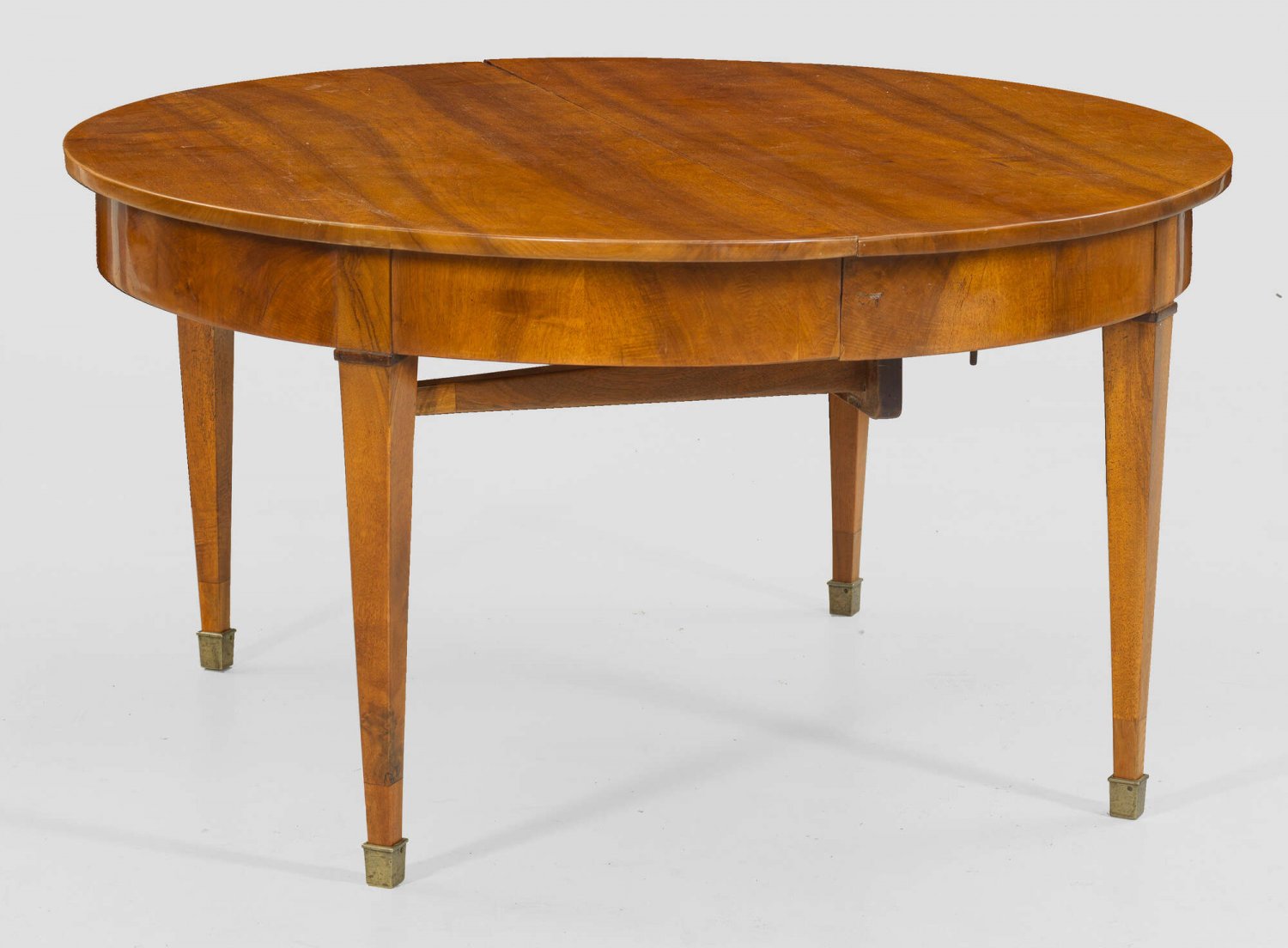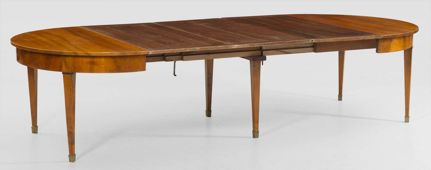 Großer Biedermeier-Ausziehtisch Nussbaum, massiv und furniert. Bombierte Zarge auf konischen Vierkantbeinen mit Messingkappen. Gering überstehende Deckplatte. Dazu vier unfurnierte Einsteckplatten. H. 74 cm. 140 cm x 137/377 cm.