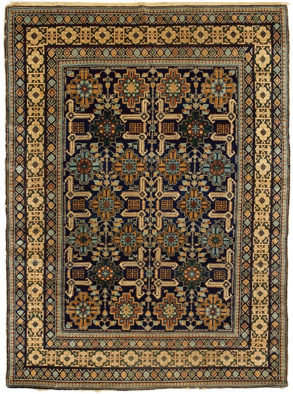 Alte Ardebil-Brücke Persien. Um 1940. Wolle auf Baumwolle. Auf dunklem Fond flächendeckende Mosaikmusterung aus Kartuschenmotiven und Hakenbändern. Umlaufend breite Bordüre aus unterschiedlichen Rautenbändern in Gelb-, Hellblau- und Brauntönen. 211 cm x 151 cm.