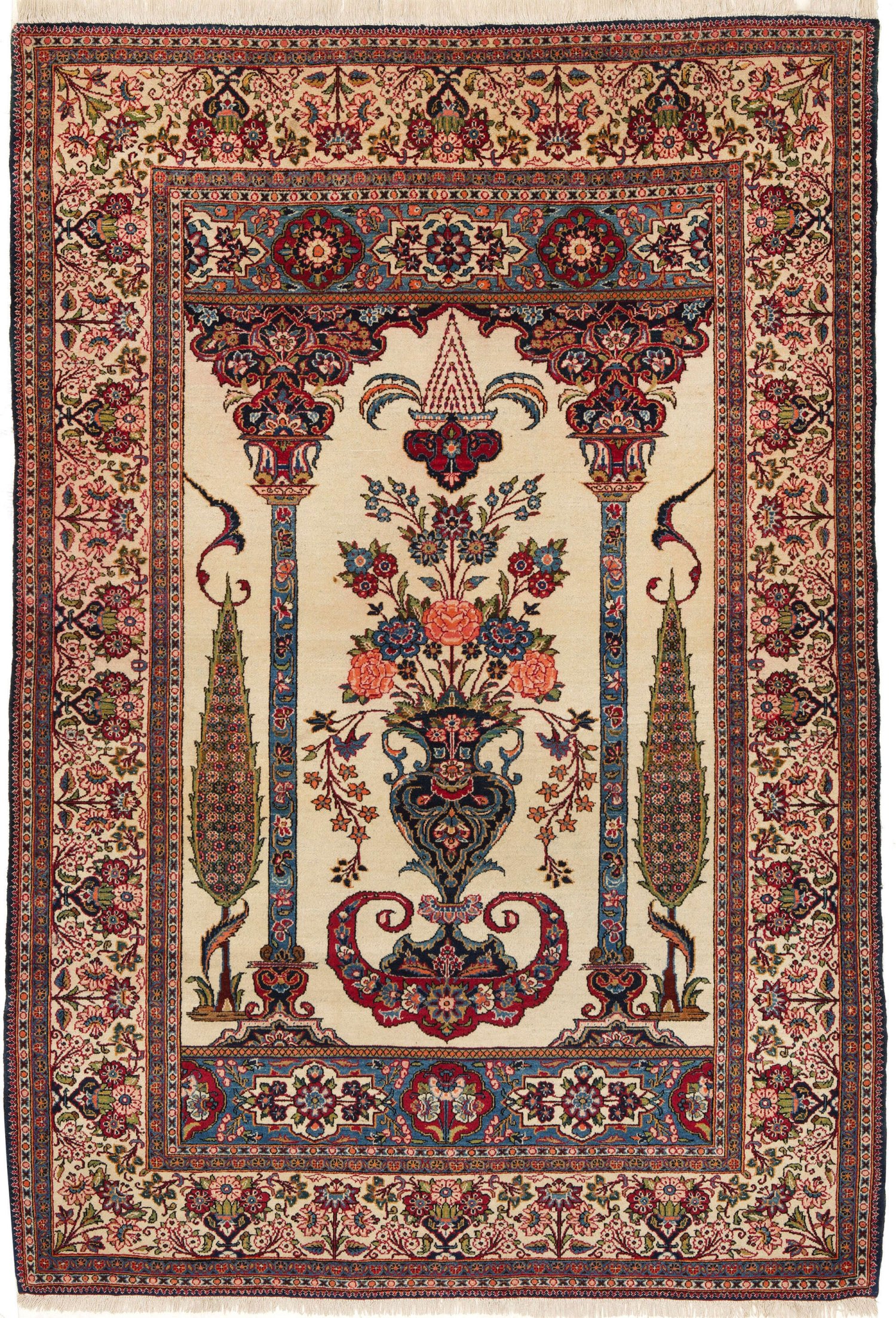 Alte Keshan-Gebetsbrücke Persien. Um 1940. Korkwolle auf Baumwolle. Auf elfenbeinfarbenem Fond architektonisch gegliederte Gebetsnische aus blütengefüllten Pilastern, flankiert von Lebensbaummotiven. In der Mitte große, blütengefüllte Vase. Umlaufend korrespondierende, dicht gemusterte Blütenbordüre. 205 cm x 134 cm.