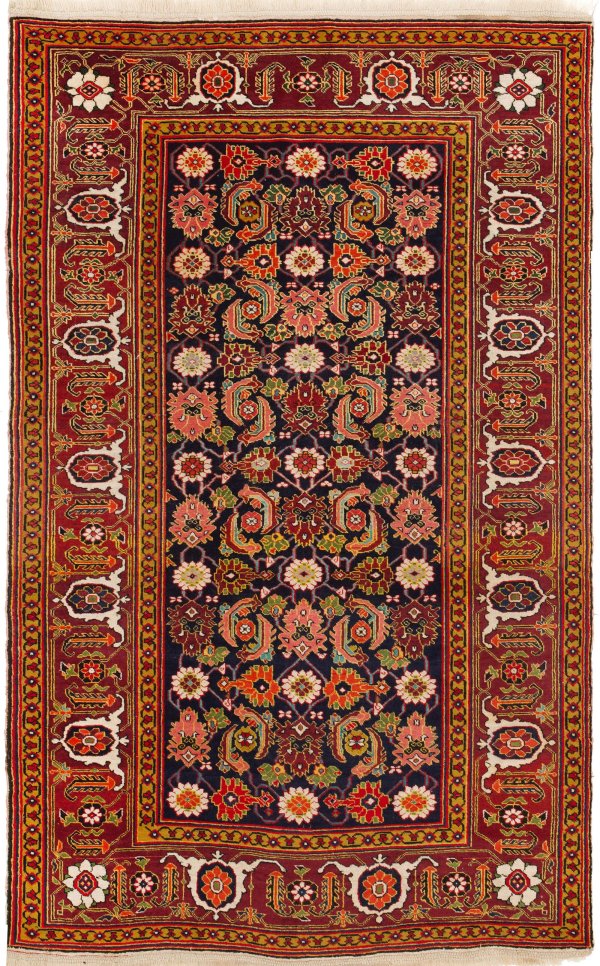 Khorasan-Brücke Persien. Mitte 20. Jh.; Wolle auf Wolle. Im dunklen Innenfeld flächendeckende Musterung aus Palmetten und Blütenrosetten im Rapport. Umlaufend breite, rotgrundige Bordüre aus Palmetten, von schmalen Bändern begrenzt. 245 cm x 150 cm.