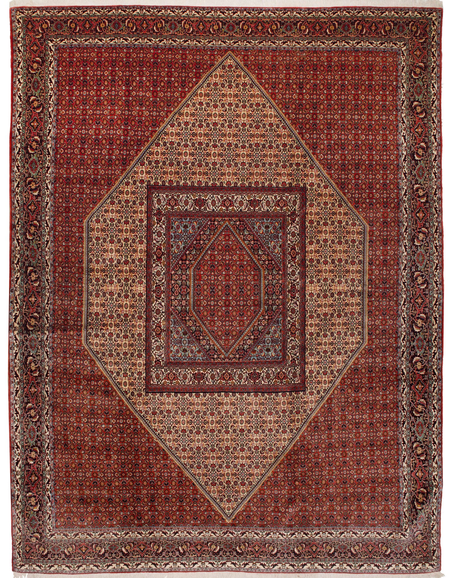 Großer Bidjar-Teppich Persien. Wolle auf Baumwolle. Feine Knüpfung. Auf rotem Fond großes gestrecktes, beigefarbenes Rautenmotiv sowie gestaffelt angeordnete Reserven in Rot- und Blautönen. Flächendeckend dichte sog. Herati-Musterung. Umlaufend mehrteilige Bordüre aus Palmettenranken. 400 cm x 297 cm.