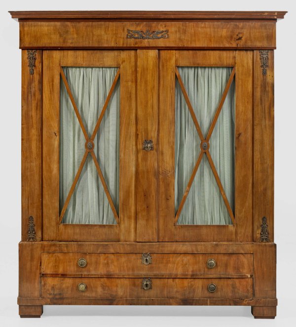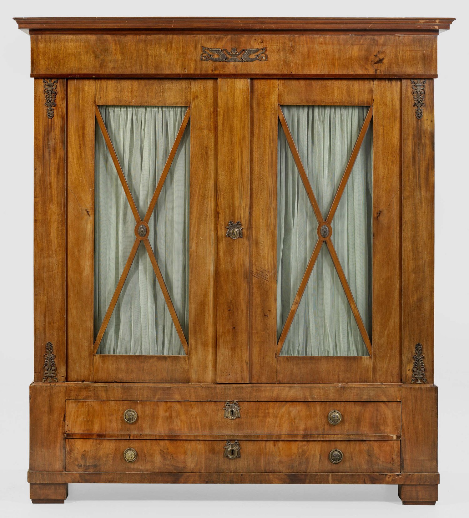 Biedermeier-Kleiderschrank Mahagoni, furniert. Gerader, rechteckiger Korpus auf zweischübigem Sockel und gekanteten Füßen. In der gegliederten Front zwei sprossenverglaste Türen, flankiert von breiten Lisenen. Breites Giebelfeld mit leicht vorkragendem Gesims. Applikationen aus Bronze. 207 cm. 187 cm x 70 cm.