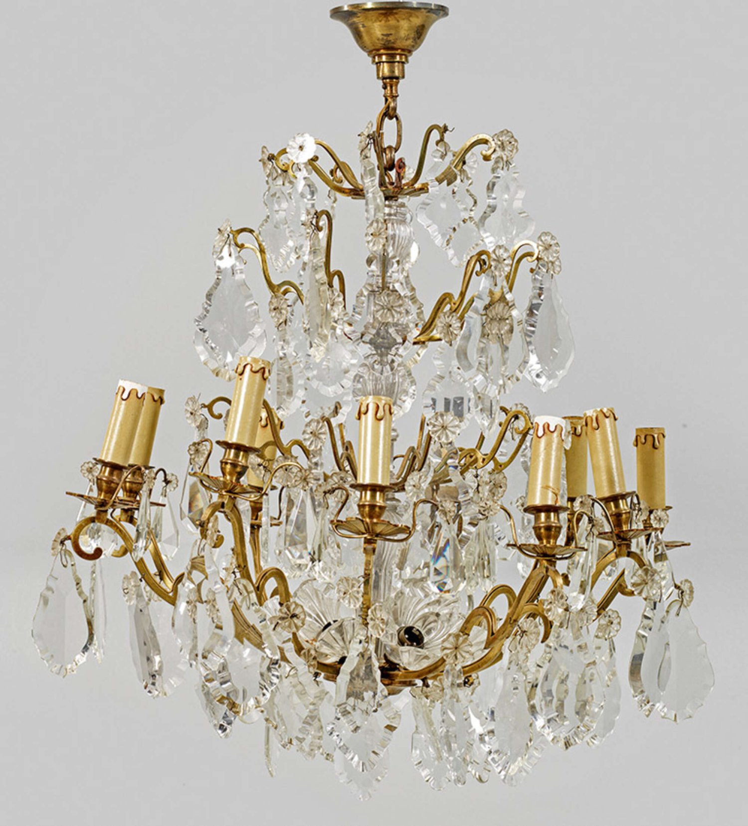 Maria Theresia-Deckenlüster 10-flg.; Messing und farbloses Kristallglas. Mehrfach gegliederter Balusterschaft. Davon ausgehend stark geschwungene Leuchterarme mit vasenförmigen Tüllen sowie oberhalb korrespondierende Streben. Üppiger Behang aus großen unterschiedlichen Prismen. Innen fünf blütenförmige Lampenfassungen. Elektrifiziert. Unw. besch.; H. 77 cm. D. 60 cm.
