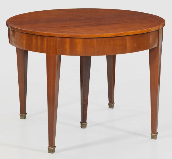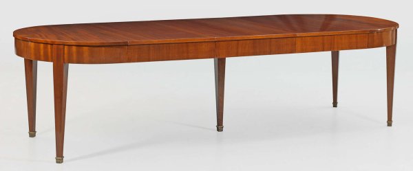 Großer Biedermeier-Ausziehtisch Mahagoni, furniert. Bombierte Zarge auf konischen Vierkantbeinen mit Messingkappen. Gering überstehende Deckplatte. Dazu fünf erg. Einlegeplatten. H. 79 cm. 115,5 cm x 114/419 cm.