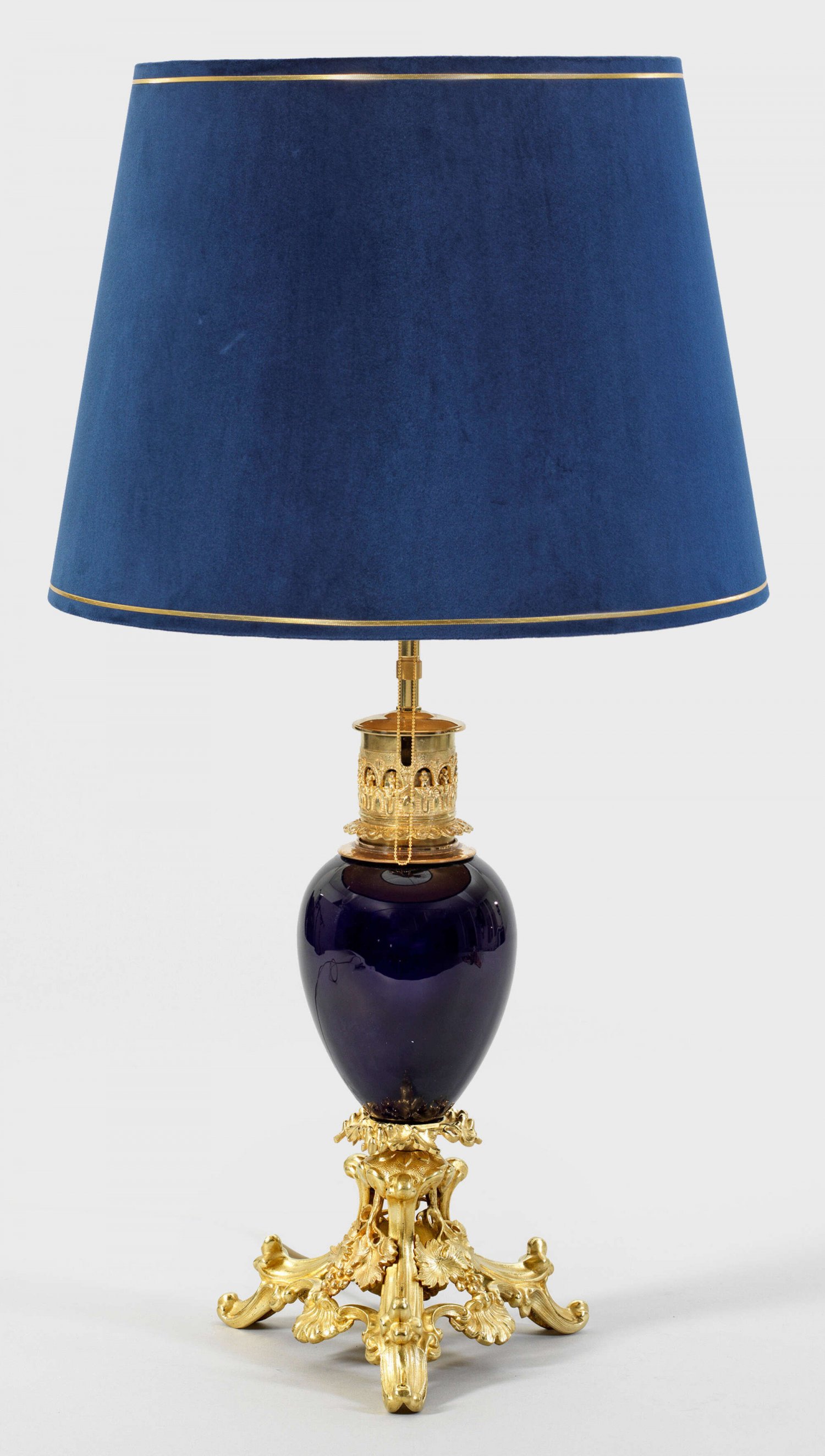 Große Belle Epoque-Tischlampe 2-flg.; Bronze und Messing, vergoldet sowie kobaltblaues Porzellan. Balusterförmiger Korpus auf durchbrochen gearbeitetem, geschweift ansteigendem Sockel aus Voluten und Weinlaub als Träger für Leuchtmittel. Konischer Lampenschirm. Elektrifiziert. H. 75 cm.