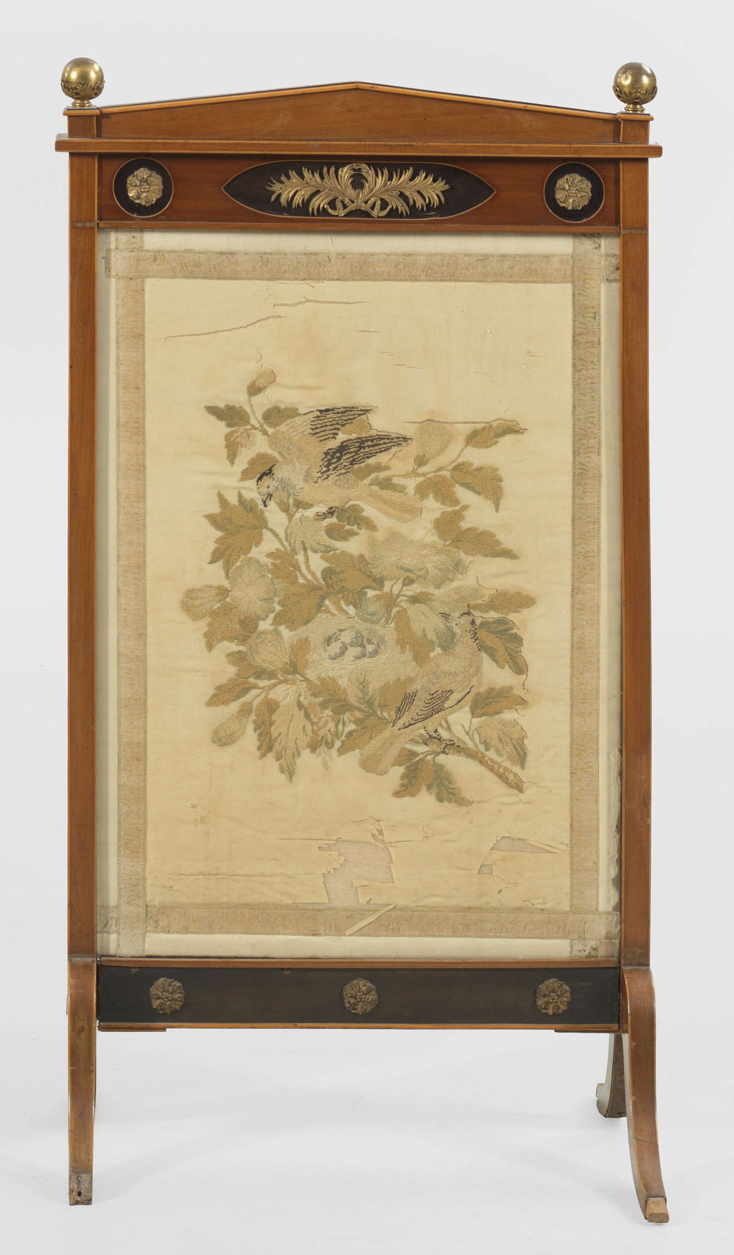 Biedermeier-Ofenschirm Mahagoni, furniert sowie teilw. ebonisiert. Hochrechteckige Rahmung auf geschweiften Beinen mit dachförmigem oberen Abschluss und Kugelbekrönungen. Schauseitig verglaste, floral gestaltete Petit Point-Stickerei, besch.; Applikationen aus Messing. H. 115 cm. 62 cm x 46 cm.