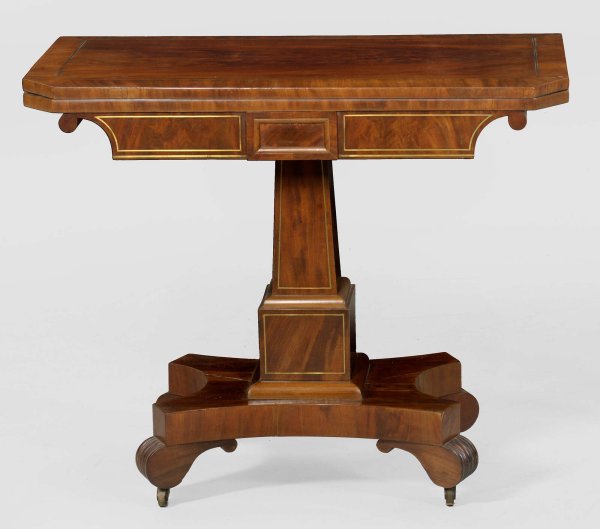 Biedermeier-Spieltisch Mahagoni, furniert sowie Einlagen aus Messing. Über konkav eingezogener Sockelplatte auf Volutenfüßen mit Rollen konisch ansteigender, gekanteter Schaft als Träger für Zargenkasten sowie klappbare Deckplatte mit Filzauflage. H. 74 cm. 89 cm x 43,5/87 cm.