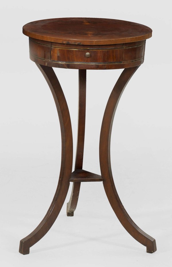 Biedermeier-Gueridon Mahagoni, furniert sowie Einlagen aus Messing. Bombierter, einschübiger Zargenkasten auf stark gebogten Vierkantbeinen, durch kleine Abstellfläche verbunden. Runde, gering überstehende Deckplatte. H. 79 cm. D. 45 cm.