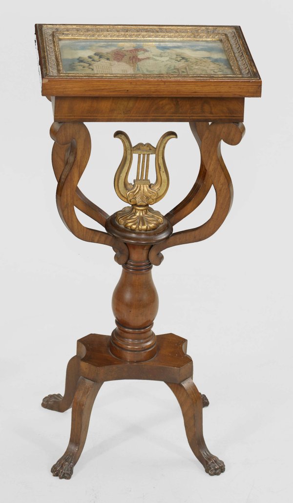 Kleiner Biedermeier-Beistelltisch Mahagoni, furniert sowie Holz, geschnitzt, gefasst und vergoldet. Über vierseitig eingezogener Sockelplatte auf geschwungenen Beinen mit Tatzenfüßen gegliederter Balusterschaft mit Lyramotiv und volutenförmigen Streben als Träger für rechteckige Deckplatte mit profilgerahmter, verglaster Petit Point-Stickerei. H. 79 cm. 39 cm x 26 cm.