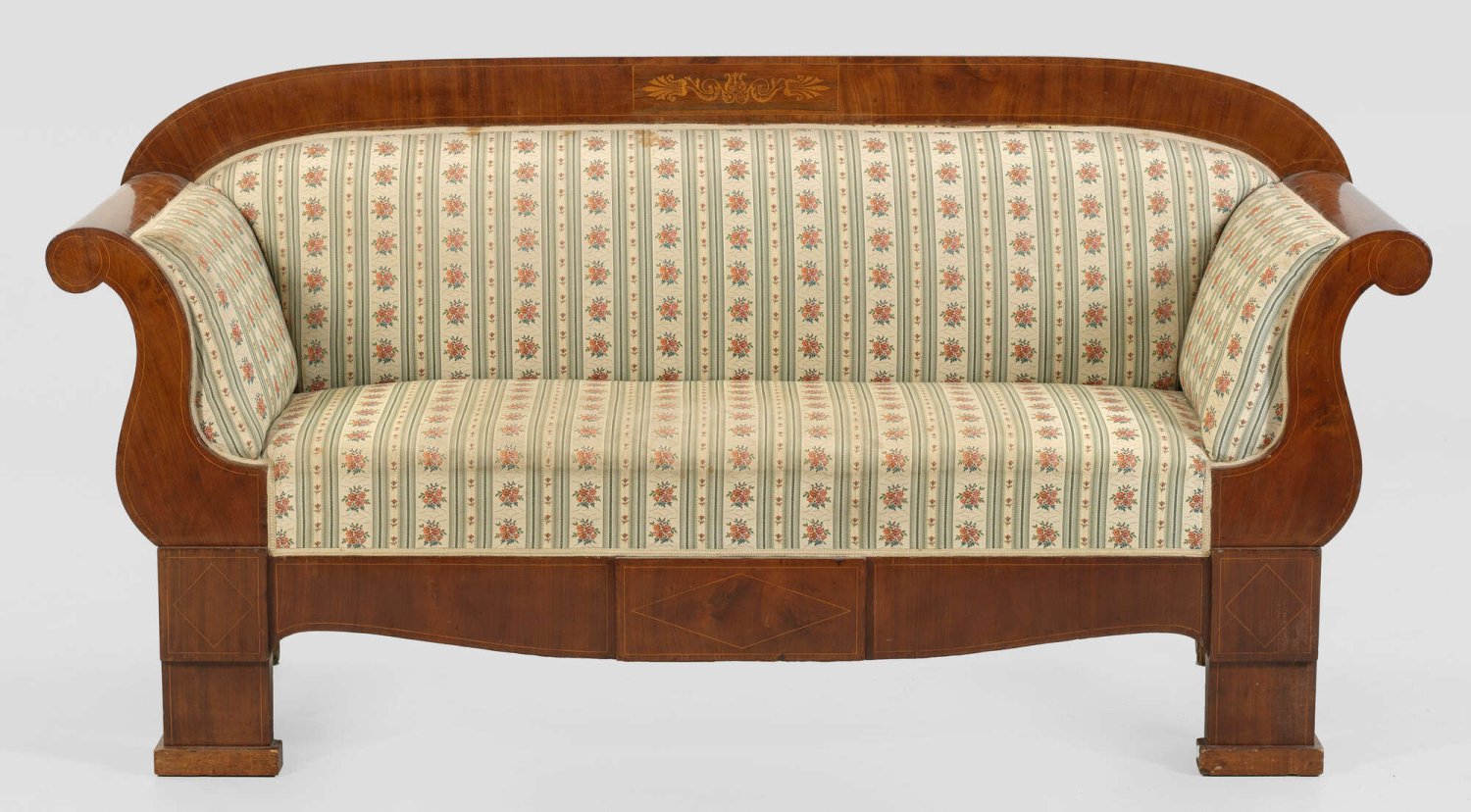 Biedermeier-Sofa Mahagoni, furniert. Leicht geschweifte Zarge auf pfostenförmigen Füßen. Volutenförmige, gerundete Armlehnen. Breite, gewölbte Rückenlehnenrahmung mit intarsiertem Lyramotiv und Blattvoluten. Gepolstert und bezogen. H. 97,5 cm. 197 cm x 68 cm.