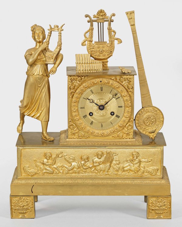 Pendule im Empire-Stil Bronze. Vollplastische Darstellung einer Lyraspielerin mit Attributen der Musik. Rechteckiges Uhrengehäuse auf hohem Podestsockel mit Puttenfries. Pendulenwerk mit Fadenaufhängung sowie Halbstundenschlag auf Glocke. Besch.; H. 39 cm. 30,5 cm x 11 cm.