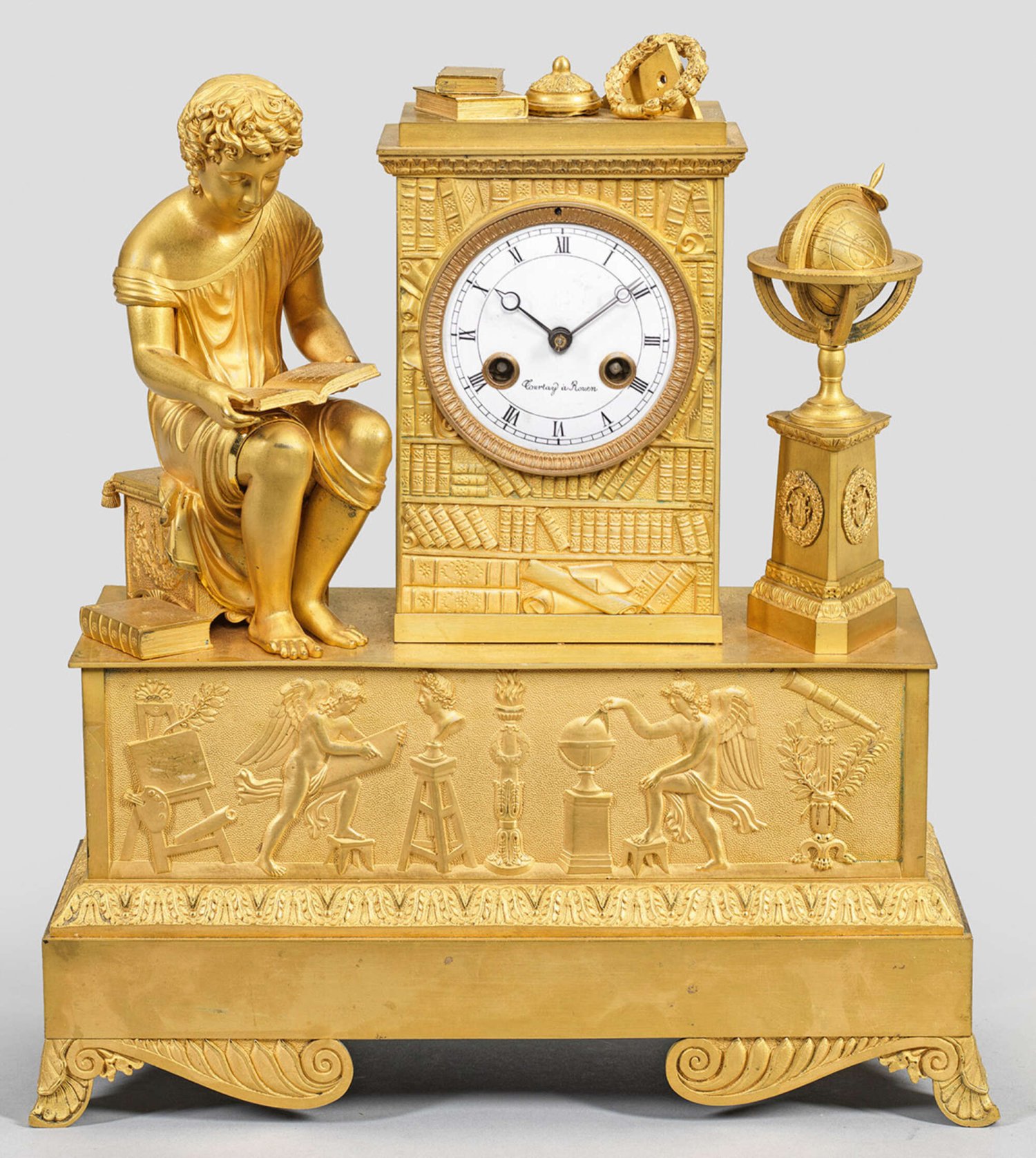 Empire-Figurenpendule Bronze, vergoldet. Vollplastische Darstellung eines lesenden Knaben. Hochrechteckiges Uhrengehäuse aus erhaben reliefierten Bücherrücken sowie Standglobus. Unterhalb hoher, querrechteckig angelegter Sockel mit breitem Genienfries als Allegorie auf die Künste und Wissenschaft. Profilgerahmtes Zifferblatt, bez. Courtay à Rouen. Pendulenwerk mit Fadenaufhängung sowie Halbstundenschlag auf Glocke. H. 39 cm. 35 cm x 12,5 cm.