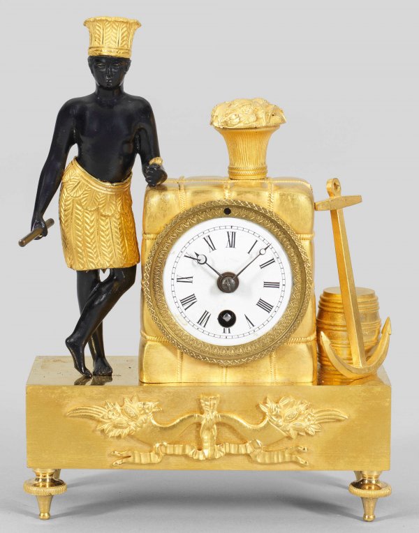 Empire-Miniaturpendule "Au bon Sauvage" Bronze, vergoldet bzw. schwarz patiniert. Über querrechteckig angelegtem Sockel mit Balusterfüßen vollplastische, allegorische Darstellung Amerikas auf das rechteckige Uhrengehäuse in Form eines großen verschnürten Pakets gestützt. Daneben Anker und Fass als Attribute der Seefahrt. Profilgerahmtes Emailzifferblatt sowie erg. Werk mit Echappement. Rest. mit Erg.; H. 19,5 cm. 14 cm x 6 cm.