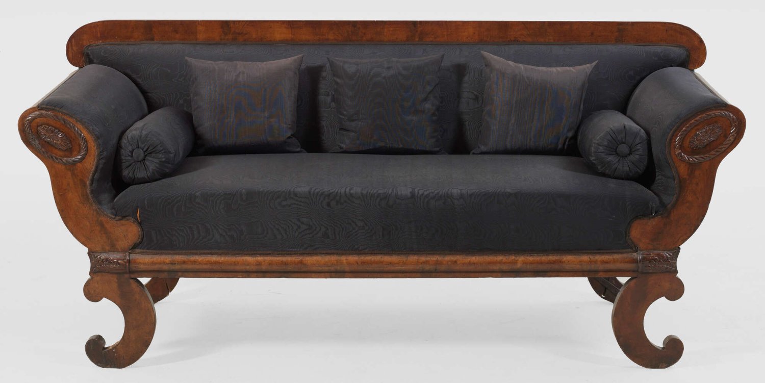 Großes Biedermeier-Sofa Mahagoni, furniert. Gerade Zarge auf stark ausschwingenden Volutenfüßen. Breit geschweifte Armlehnen sowie gerade Rückenlehnenrahmung. Schauseitig gepolstert und bezogen. H. 96 cm. 215 cm x 70 cm. Sitz-H. 56 cm.