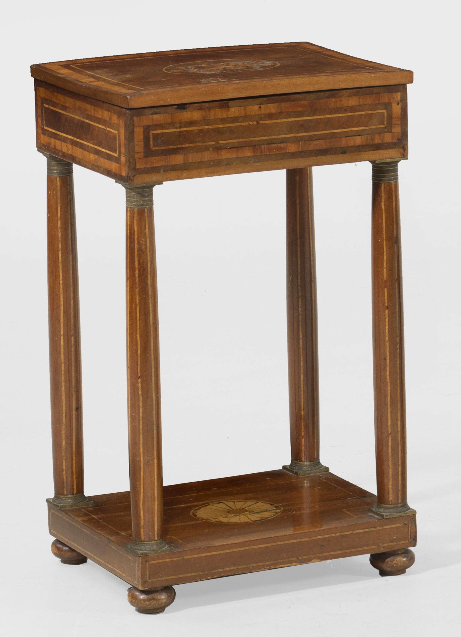 Biedermeier-Pfeilertischchen Mahagoni furniert sowie Einlagen aus unterschiedlichen Edelhölzern. Gerader Zargenkasten mit aufklappbarer Deckplatte auf konischen Vollsäulen sowie entsprechendem Sockel. Altersspuren. H. 70 cm. 42 cm x 34,5 cm.