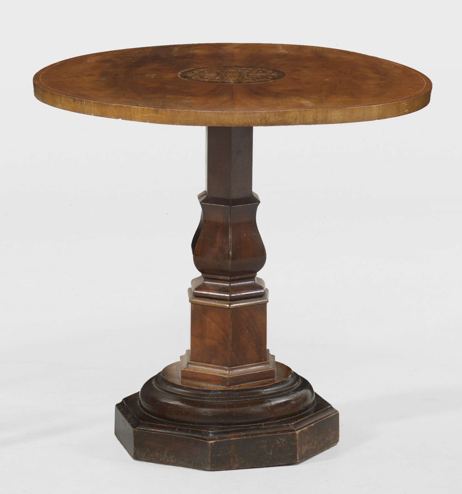 Kleiner Spätbiedermeier-Salontisch Mahagoni, furniert sowie Einlagen aus unterschiedlichen Edelhölzern. Über oktogonaler Sockelplatte mehrfach gegliederter, gekanteter Balusterschaft als Träger für runde Deckplatte mit intarsiertem Tondo. H. 64 cm. D. 68 cm.