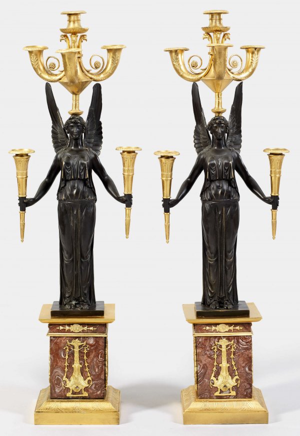 Paar große Empire-Figurengirandolen 6-flg.; Bronze, vergoldet bzw. schwarz patiniert sowie rot gemaserter Marmor. Vollplastische Darstellung von Viktorien mit Fackeln. Auf ihrem Kopf balusterförmiges Girandolenelement aus geschwungenen Leuchterarmen sowie schmalen Voluten mit Greifenköpfen. Unterhalb hoher Podestsockel mit reliefierten Applikationen sowie breitem Palmettenfries. H. 81 cm.
