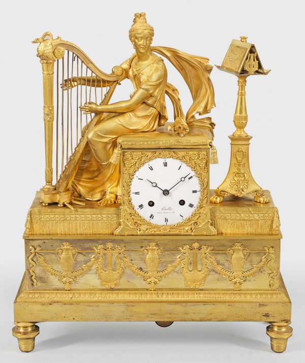 Empire-Figurenpendule "Harfenspielerin" Bronze, vergoldet. Vollplastische Darstellung einer jungen Harfenspielerin in antikisierendem Gewand, auf dem rechteckigen Uhrengehäuse sitzend. Unterhalb querrechteckig angelegter Sockel mit breitem Fries aus erhaben reliefierten Lyren, Vasenmotiven und Festons. Emailzifferblatt bez. Kinable Palais Royal. Pendulenwerk mit Fadenaufhängung sowie Halbstundenschlag auf Glocke. Vergoldung teilw. rest.; H. 44 cm. 36 cm x 14 cm.